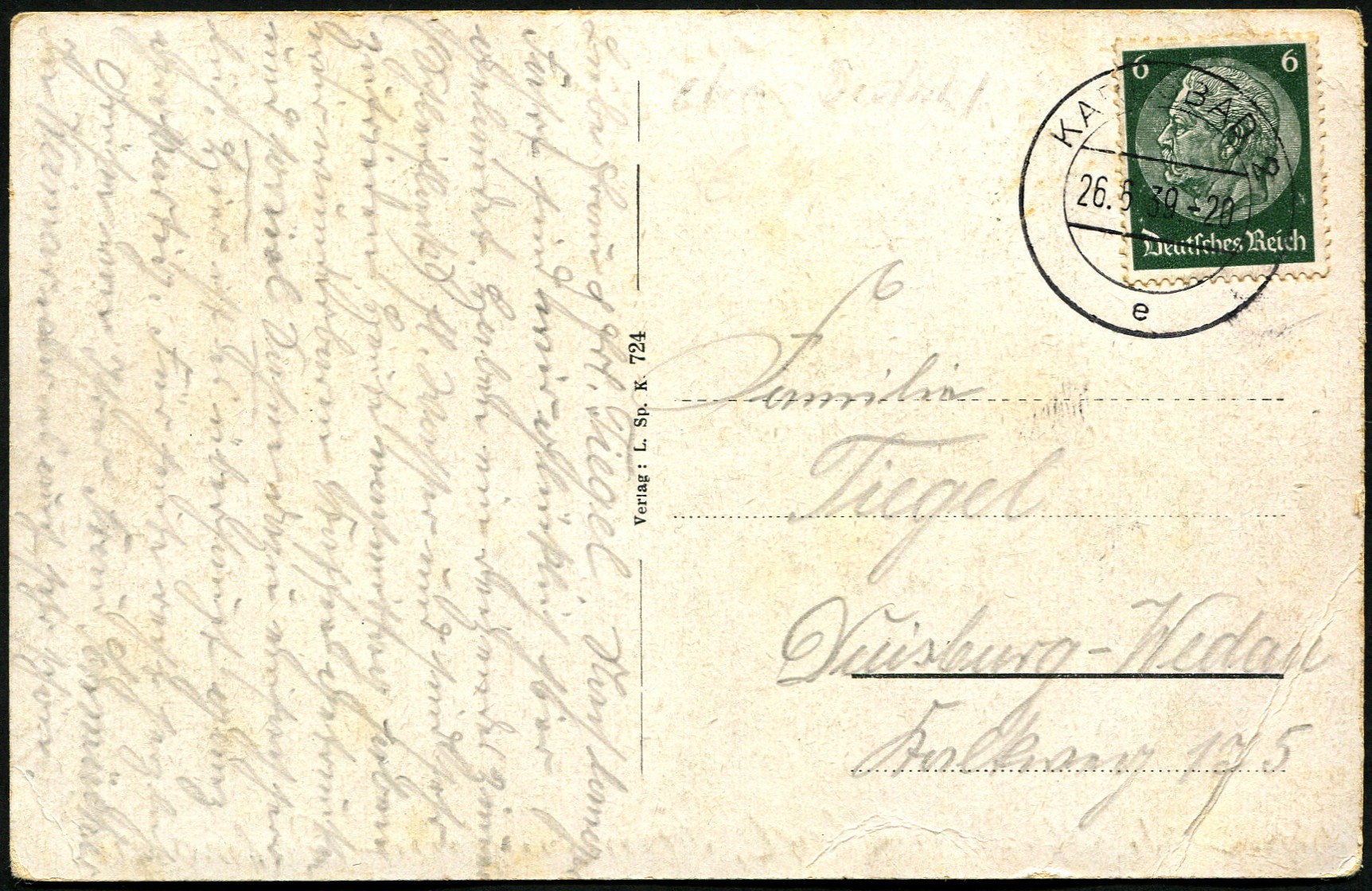 Die Ansichtskarte lief am 15.09.1938 ab Karlsbad und trägt einen Maschinenstempel des Postamtes Karlsbad 1. Die Frankatur, bestehend aus einer Briefmarke, ist leider nicht mehr vorhanden.
