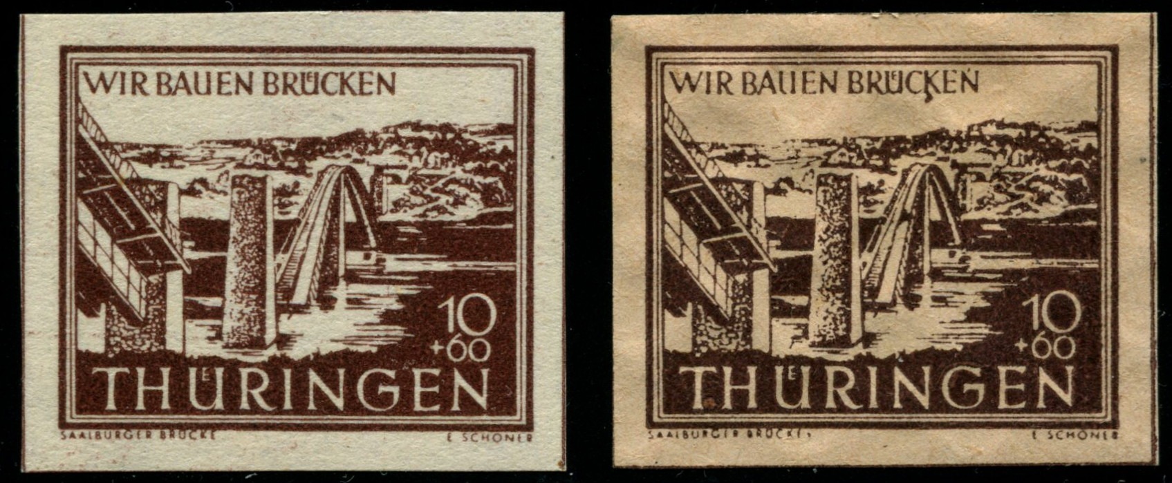 Diese Sonderdrucke von der Ausgabe "Wiederaufbau zerstörter Brücken in Thüringen" wurden nur geschnitten und auf weißem Papier mit Vollgummierung (Papier x) hergestellt. Diese Drucke wurden offiziell über die Versandstelle der OPD Erfurt beim Postamt Erfurt 1 an das Publikum verkauft und waren voll frankaturgültig.