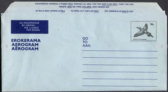 Kann mir jemand mit den Aerogrammen Buphuthatswanas helfen. 2 sind 1977 verausgabt worden, einmal für Inland und einmal für Ausland. Soweit ich sehe für 4c und 10c.