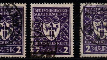 Druckabweichungen und Abarten sind nicht bekannt.Mir fehlen (wie bei allen Marken der Deutschen Gewerbeschau) die teuren Unterfarben. Ich kann nur drei gestempelte und inflageprüfte Farbtöne der a)-Farbe zeigen. erron zeigt beide Farben in der PHILA-DB. Hier habe ich auch eine postfrische Marke vom Oberrand, ein Exemplar der oberen linken Bogenecke. Postfrische Paare vom Unterrand mit den beiden katalogisierten HAN H 7990.21 und H 2562.22 sind in der a)-Farbe nicht teuer, fehlen aber aktuell in meiner Sammlung