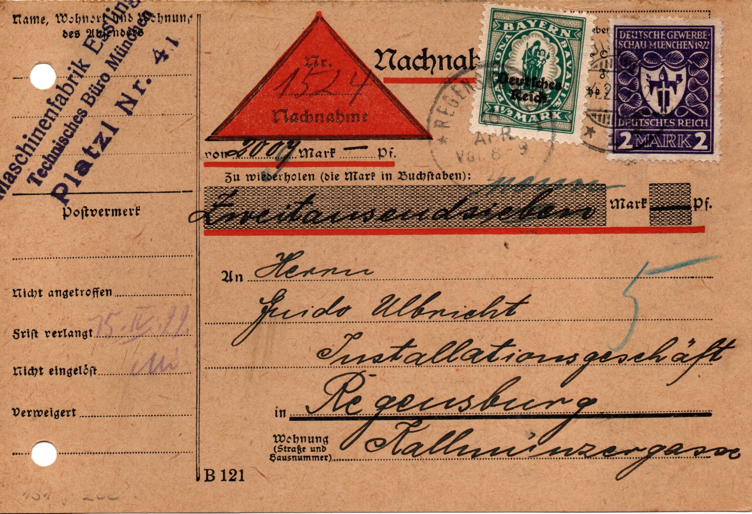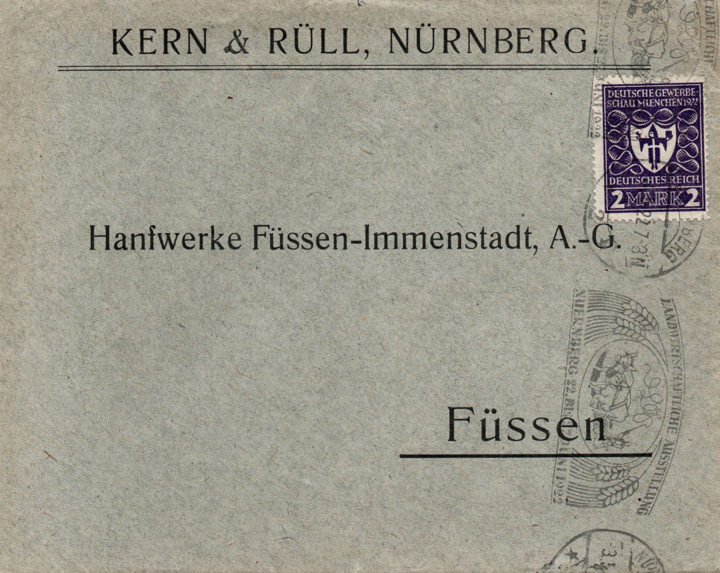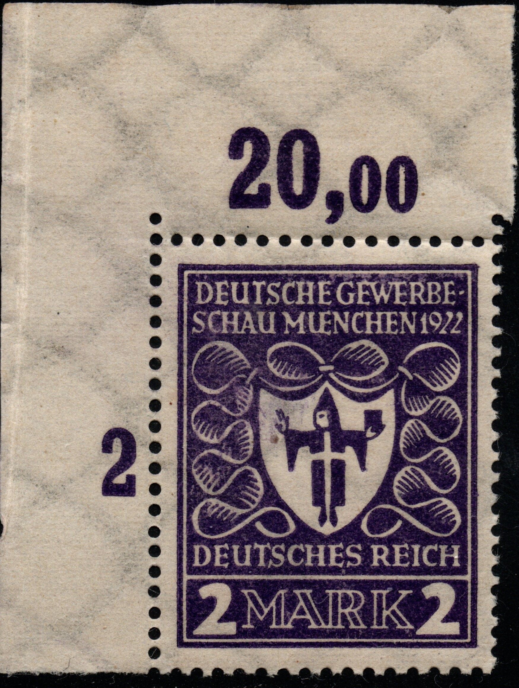 für den 2 Mk. Wert der Ausgabe Deutsche Gewerbeschau München gilt weitestgehend dasselbe wie für den 1 1/4 Mark Wert. Die Marken kamen am 2. April 1922 an die Postschalter. Sie wurden wurden im Buchdruckverfahren im Plattendruck in Bögen mit zwei Markenfeldern zu 10 x 5 Marken getrennt durch einen Zwischensteg gedruckt. Es sind zwei HAN katalogisiert, die Gesamtauflage ist nicht bekannt. https://www.philadb.com/?site=list&catid=&catuid=484&id=529