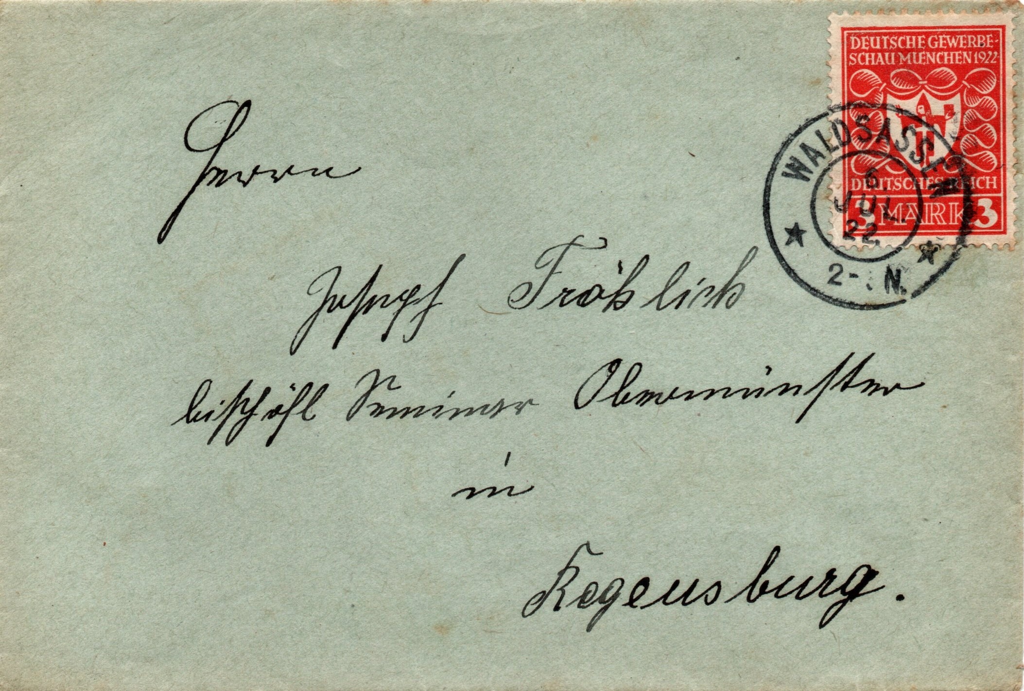 Ich habe aktuell nur einen einzigen mit einer 3 Mk. Deutsche Gewerbeschau 1922 frankierten Beleg. Eine Einzelfrnkatur auf einem Inlandsbrief aus Waldsassen nach Regensburg vom 6. Juli 1922, also PP8.
