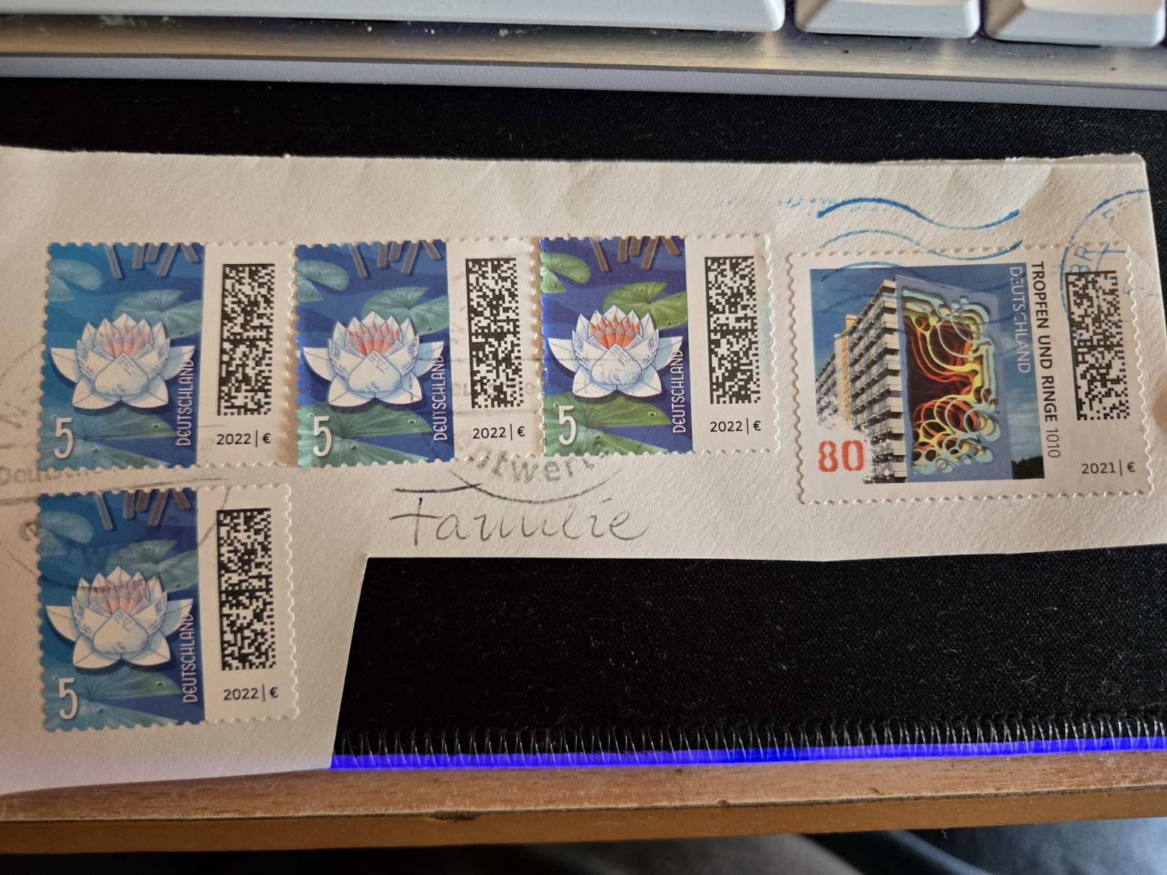 Ich habe Heute mal mir einen Karton Kiloware gegönnt und aufgemacht. darin habe ich gleich als erstes einen tollen Briefabschnitt gefunden, wo ich mich frage ob ich hier eine seltene Farbe gefunden habe oder ob die Briefmarken einfach nur ausgeblichen sind.