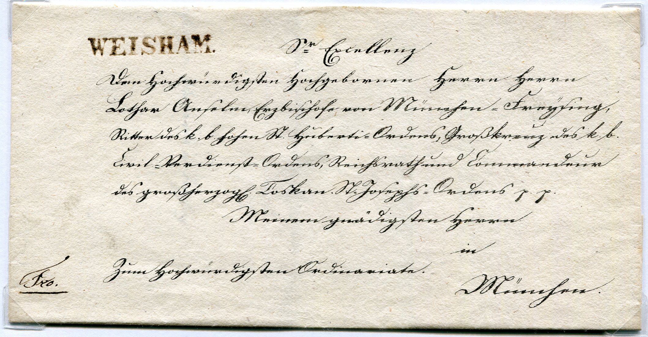 Leider fehlt deshalb auch ein Datum. Abgestempelt wurde er mit einem Linienstempel "R4 Furstenfeldbruck" Laut Feuser / Münzberg die früheste, ab 1808 in Fürstenfeldbruck verwendete Stempeltype. Laut Handbuch tatsächlich mit u und nicht mit ü geschrieben.
