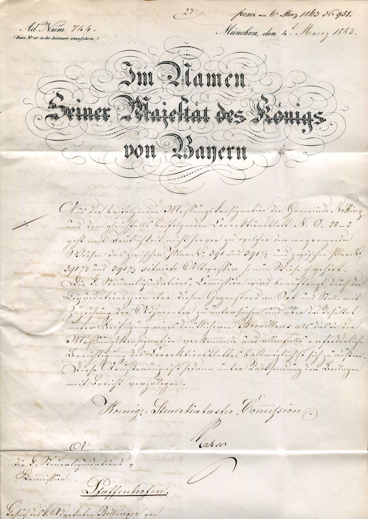 Teilvorgedruckte Regierungssache von der K.B. Steuerkataster-Commission in München an die