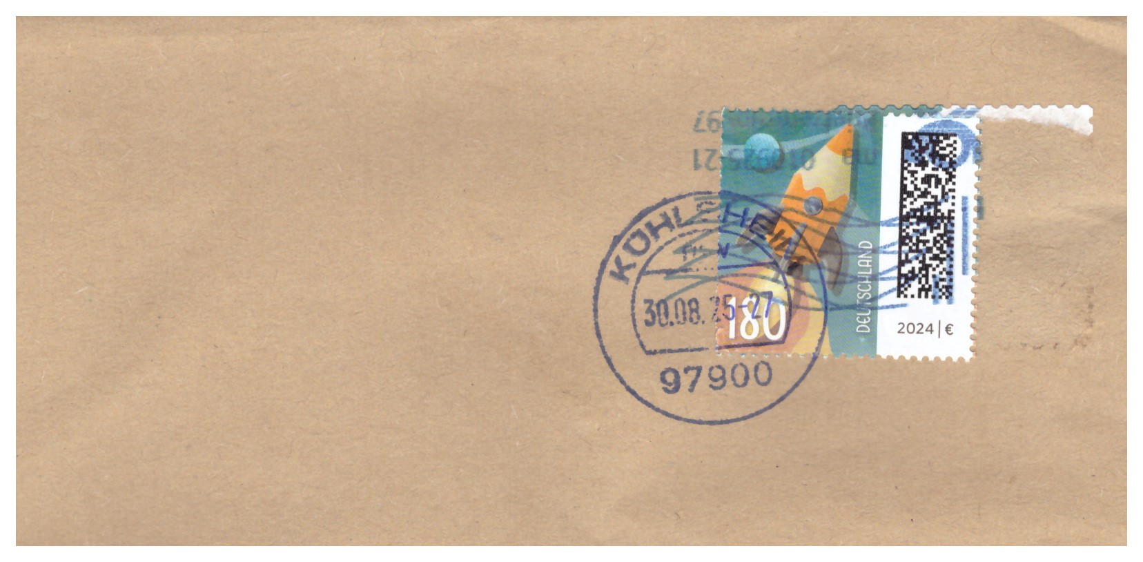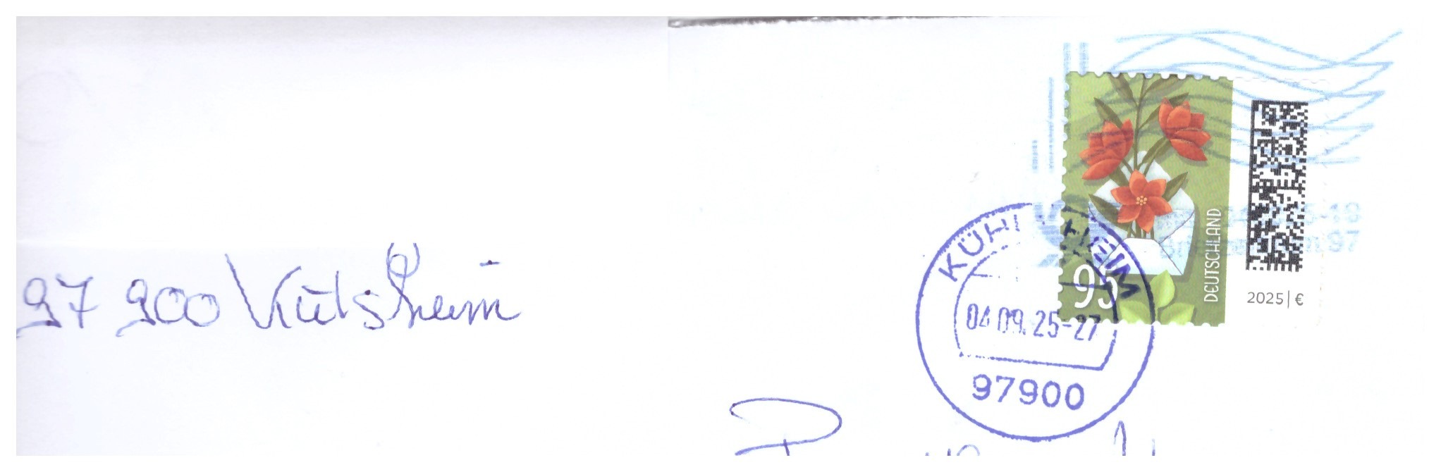 Er trägt einen Maschinenstempel vom 1.9.2025, Briefzentrum 97 - und einen Tagesstempel "97900 Kühlsheim" vom 30.08.25. Kühlsheim ist darauf doch tatsächlich falsch mit h geschrieben.