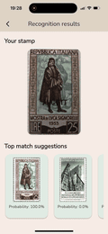 5. Wenn dann mal ein Photo genutzt wird und die Datenbank nach dem Original durchsucht wird, ist das Ergebnis sehr, sehr dürftig, die richtige Marke wird meistens nicht erkannt. Außerdem sage die App immer: "Stempel erkennen"! Warum Stempel erkennen? Kann die App nicht mit postfrischen Marken arbeiten?