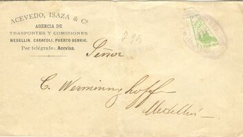 Und er zeigte einen Brief innerhalb Medellins gelaufen, frankiert mit einer halbierten 1 Peso Marke der 2. Ausgabe von 1904 (Temprano No. 7b), gestempelt mit dem ovalen Poststempel der “Correo Urbano de Medellin”.