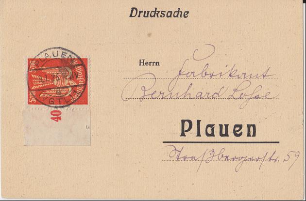 Drucksache bis 25 Gramm, versendet als Einzelfrankatur innerhalb von Plauen am 9.1.23.