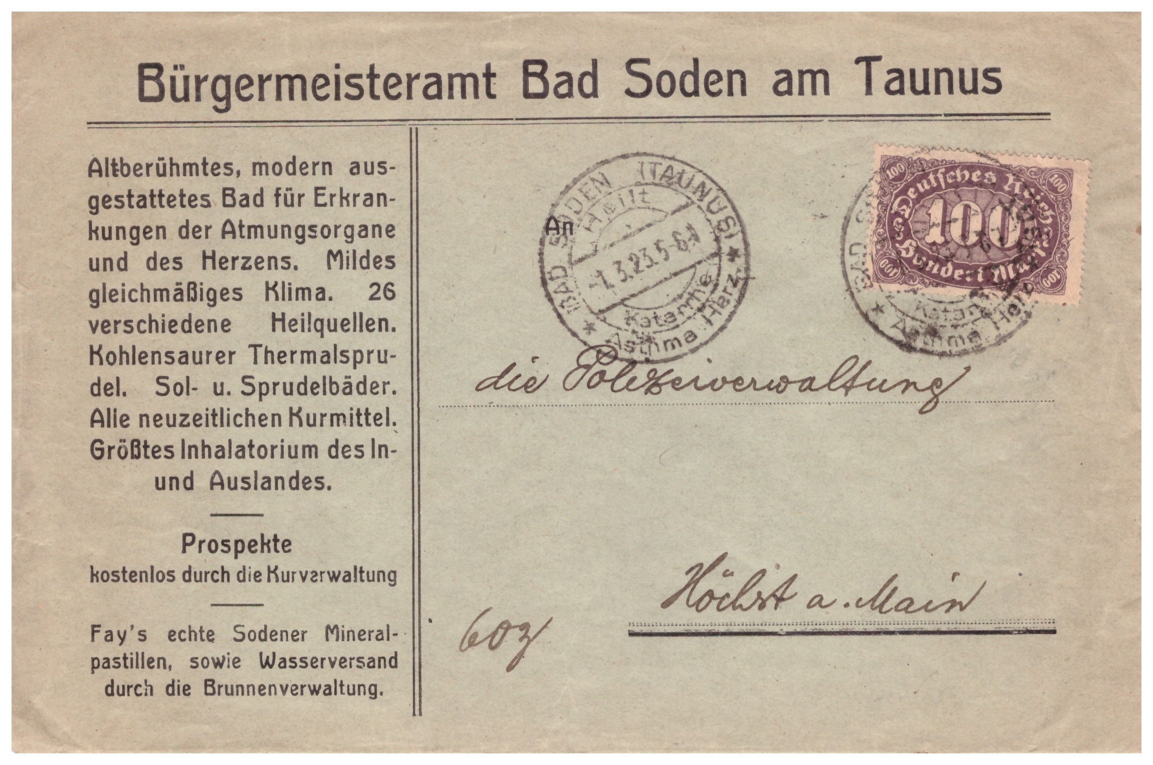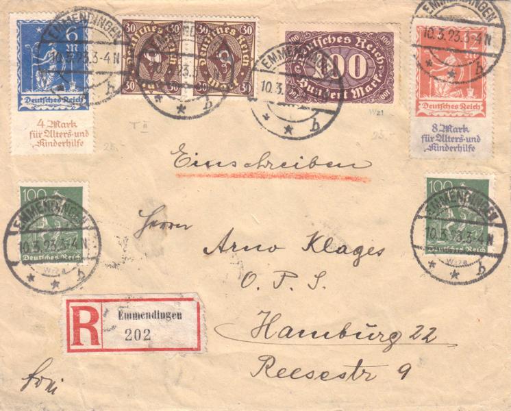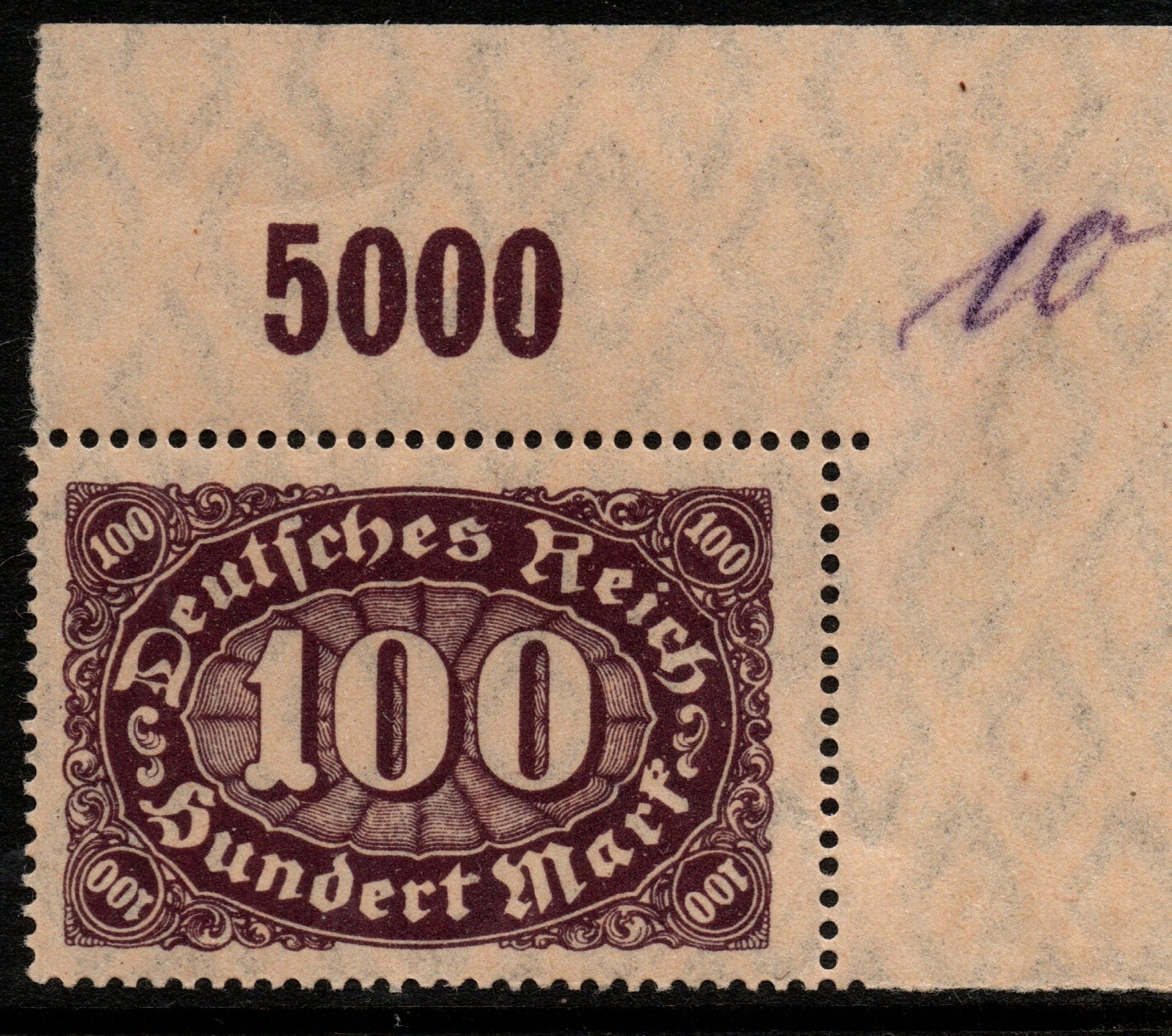im Oktober 1922 kam mit dem 100 Mk. Wert nicht nur die erste Marke der Ausgabe Ziffern im Queroval, Wz.1 Rauten, 1922, heraus, sondern auch die Marke mit dem bislang höchsten Nominale der Reichspost. Diese Ehre galt aber nur kurz. Die Marken wurden im Offsetdruckverfahren im Plattendruck in Bögen (5 x 10 Marken) produziert. Es sind drei HAN katalogisiert, die Höhe der Gesamtauflage ist nicht bekannt. Ein konkretes Frühdatum wird nicht erwähnt, es heißt nur Oktober 1922. https://philadb.com/?site=list&catid=&catuid=484&id=555