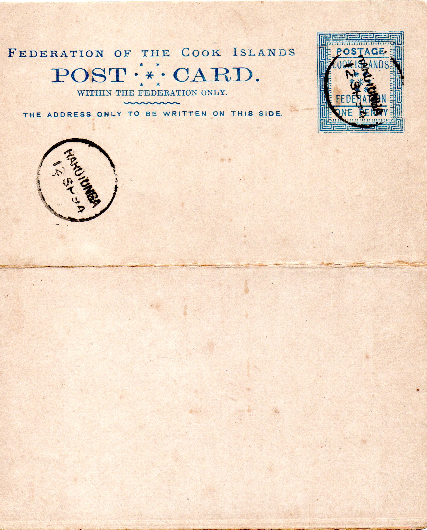 Die erste Ausgabe, ich bezeichne sie mal PS1, ist der ersten Markenausgabe der Cookinseln angelehnt und wurde in mehreren Auflagen zwischen Januar 1892 und Oktober 1893 gedruckt. Insgesamt wurden 8643 Postal Stationery in dieser Zeit gedruckt. Das Format ist ziemlich ungewöhnlich und entspricht den neuseeländischen Reply-Karten (Format 127 x 154). Die Karte ist jedoch keine Reply-Karte und so findet man häufig beschnittene Karten. Das war früher zum Sammeln bzw. verschicken wohl bequemer. Da für den Druck zwei unterschiedliche Platten benutzt wurden sind auch Unterschiede innerhalb der Ausgabe erkennbar. Es wird hierbei zwischen Typ 1 und Typ 2 unterschieden. Typ 2 hat einige Farbpunkte in der oberen rechten Ecke des Markenaufdrucks, die da eigentlich nicht hingehören. Auch ist die Druckfarbe etwas dunkler. Typ 1 hat diese Farbpunkte nicht und ist in der Druckfarbe heller. Der Typ 1 zeigt jedoch in einer Variante auch Fehler im Druckbild was wohl auf den Verschleiß der Druckplatte zurückzuführen ist. Das D in CARD scheint bei dieser Variante wie von innen angeknabbert.