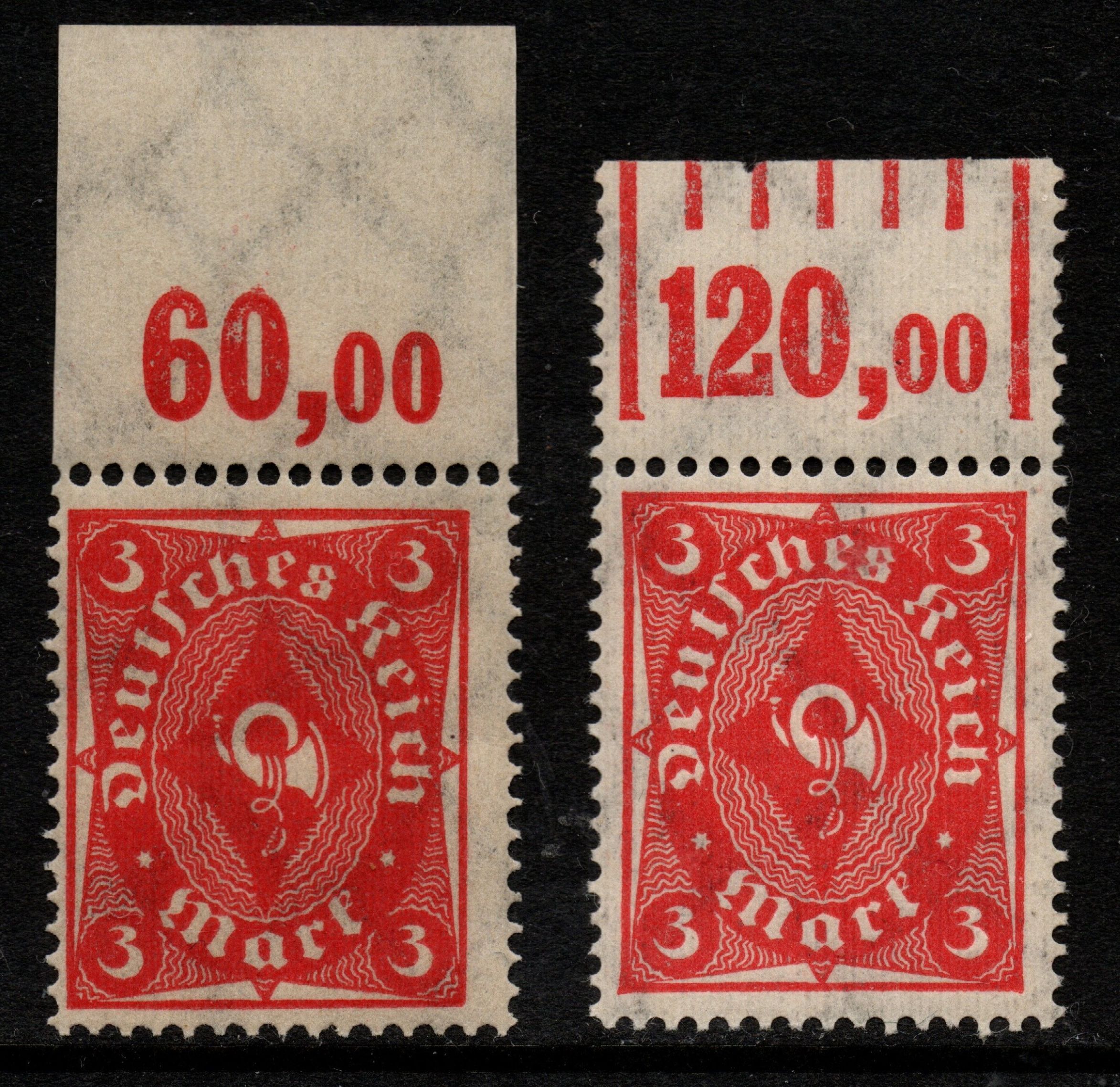 Wenn man die Ausführungen zur Erstausgabe der ersten Tranche der einfarbigen Posthornausgabe im Kohl-Handbuch liest dann erkennt man die große Unsicherheit bei den Werten zu 3 und 4 Mk. Die PHILA-DB und der Michel-Spezial 2016 sind sich mit Mai 1922 einig. Die Marken wurden im Buchdruckverfahren sowohl als Platten- als auch in Walzendruck produziert und als Bögen (10 x 10 Marken) und Rollen ausgegeben. Wie man später noch an meinen Oberrandstücken erkennen kann sind hier Platten- und Walzendruck bei Marken ohne anhängenden Bogenrand nicht unterscheidbar. Im Michel Spezial 2016 werden vier HAN katalogisiert, die Walzendruckmarken kommen nur mit dem Oberrand 1'5'1 vor, es ist also von mindestens fünf Auflagen auszugehen. Die Höhe der Gesamtauflage ist nicht bekannt aber Bern Klemm hat lt. Band 78.1 der Infla-Bücherei einige Angaben aus Archiven ausgegraben: H 4942.22, H 5260.22 und H 5687.22 umfassten 1.920.400 Marken, diese wurden im Zeitraum 1.10.22 bis 6.1.23 abgeliefert. https://philadb.com/?site=list&catid=&catuid=484&id=563
