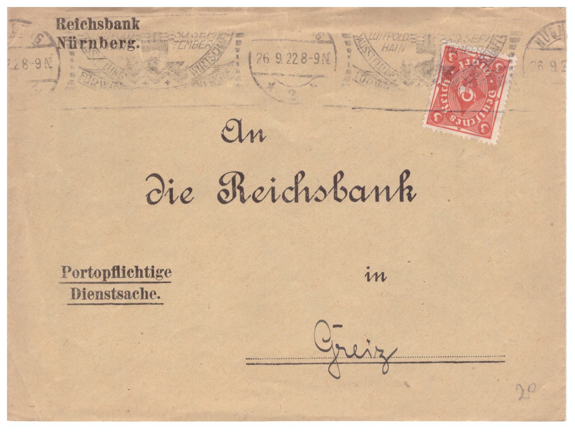 Bei diesem Dienstbrief von dem Armenrat aus Wiesenfelden, versendet am 13 Sept. 22 nach München gehörte normalerweise eine Dienstbriefmarke aus der Abschiedsausgabe von Bayern hin.