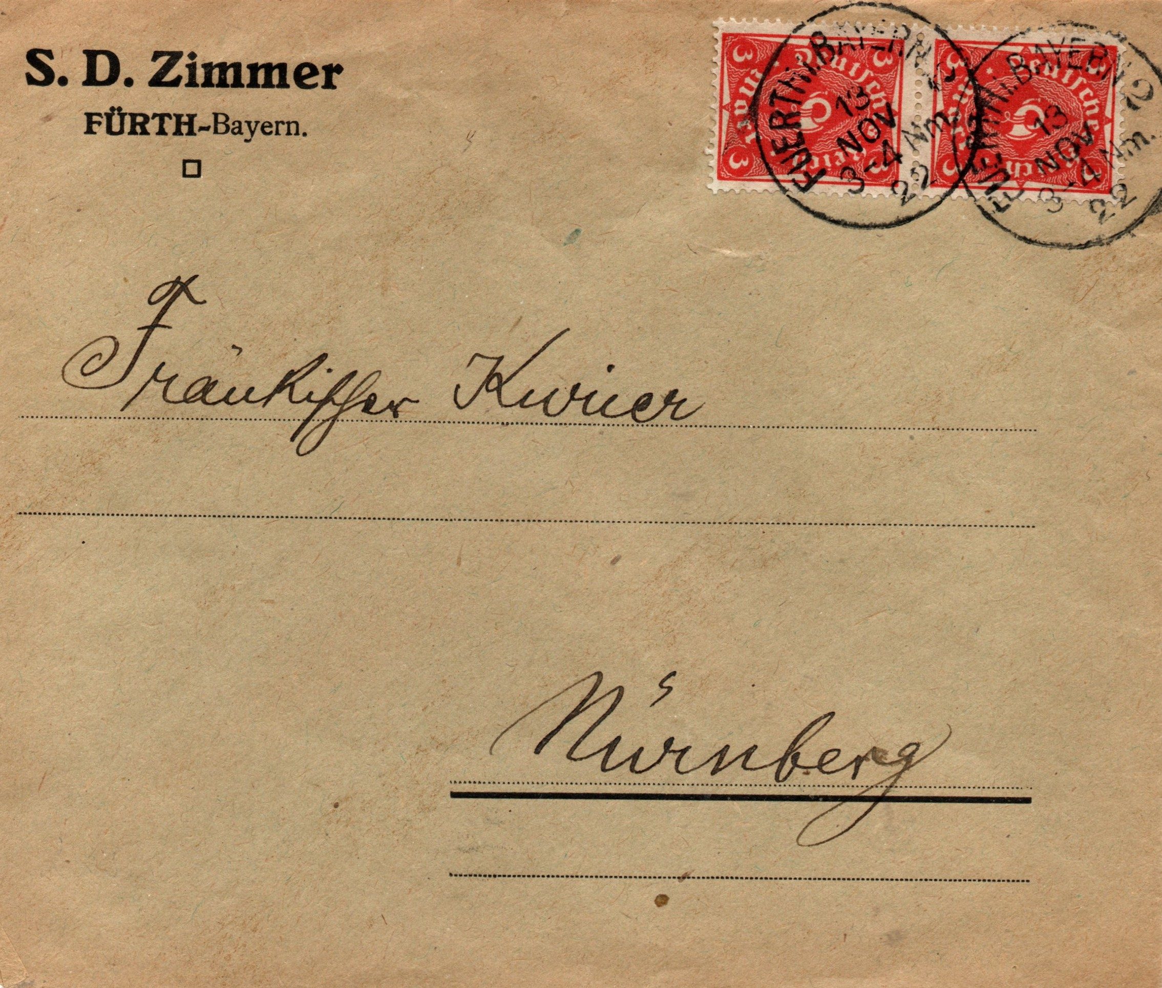 in meiner Sammlung befinden sich etliche Mehrfachfrankaturen. Ich beginne mal mit einem Inlandsbrief aus Fürth nach Nürnberg vom 13. November 1922, also PP9.