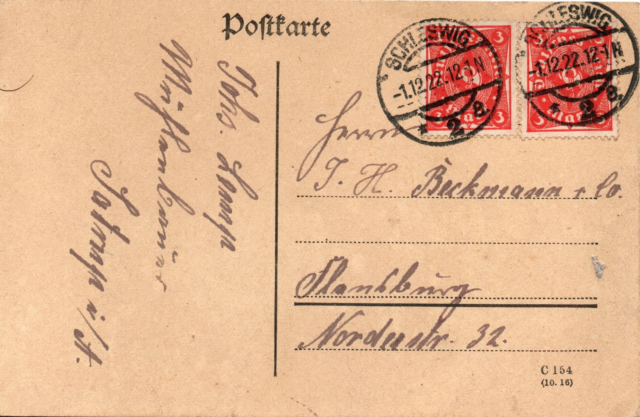eine Inlandspostkarte aus der PP10 die mit einer MeF der 3 Mk. einfarbige Posthornausgabe frankiert worden ist hat mpiodi ja schon in im Beitrag #5 gezeigt. Auch ich habe so eine Postkarte die am 1.12.22 von Schleswig nach Flensburg gelaufen ist. Korrekt frankiert mit zwei 3 Mk. Marken.