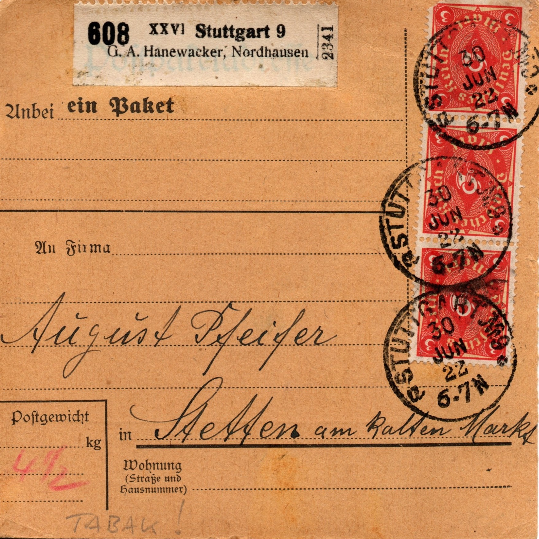 Paket mit 4 1/2 Kg Gewicht von Stuttgart nach Stetten am kalten Markt vom 30. Juni 1922, also Letzttag der PP7.