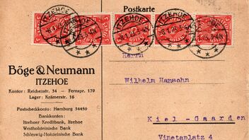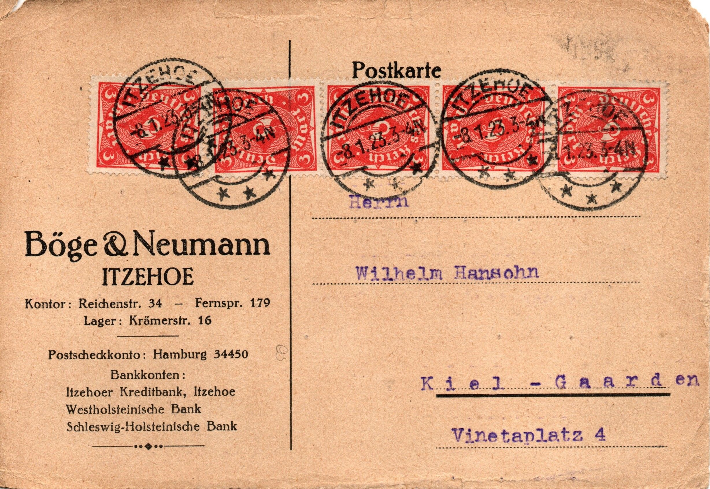 hier nun eine Postkarte aus Itzehoe nach Kiel-Gaarden vom 8.1.23. Portorichtig mit fünf 3 Mk. Marken der einfarbigen Posthornausgabe frankiert.