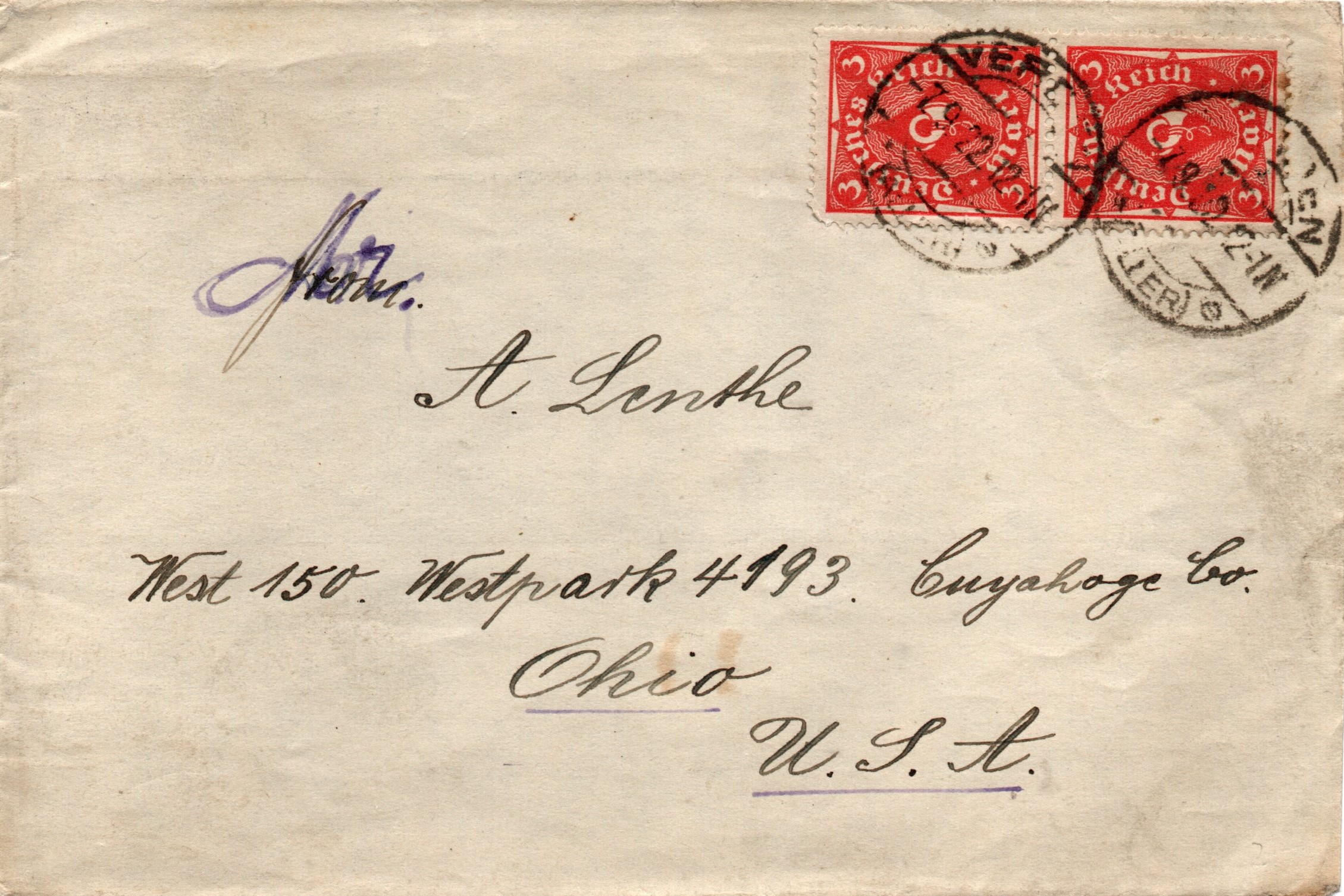 eine MeF mit 2 x 3 Mk. einfarbige Posthornausgabe auf Auslandsbrief hat auch mpiodi schon in Beitrag #5 gezeigt, sein Brief lief nach Frankreich. Ich zeige ebenfalls einen Auslandsbrief aus der PP8 der mit einem Paar des 3 Mk. Wertes frankiert wurde und in die USA lief.