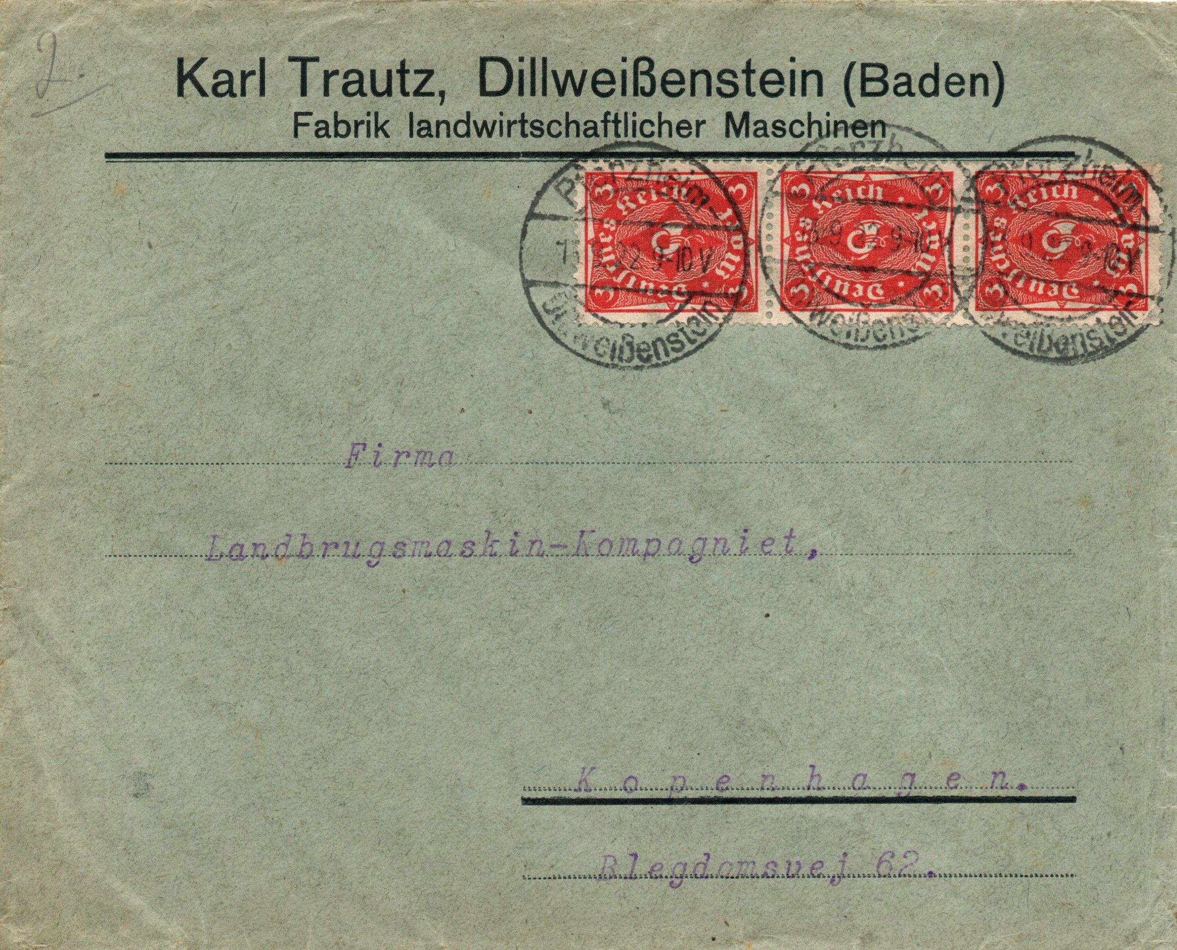 heute zeige ich einen senkrechten Dreierstreifen der 3 Mk. einfarbige Posthornausgabe als MeF auf einem Auslandsbrief der 2. Geww.stufe aus Pforzheim-Dillweißenstein nach Kopenhagen vom September 1922, also PP8.