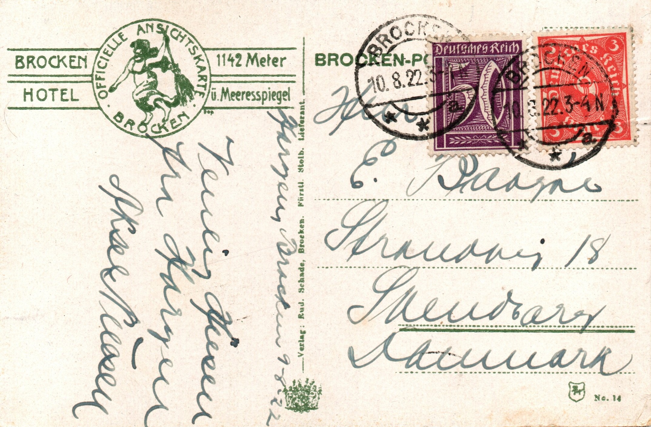 Eine Mischfrankatur mit einer 50 Pfg. Ziffernausgabe Wz. 2 Waffeln und einer 3 Mk. einfarbige Posthornausgabe auf einer Postkarte nach Svendborg in Dänemark vom 10.8.22, also PP8