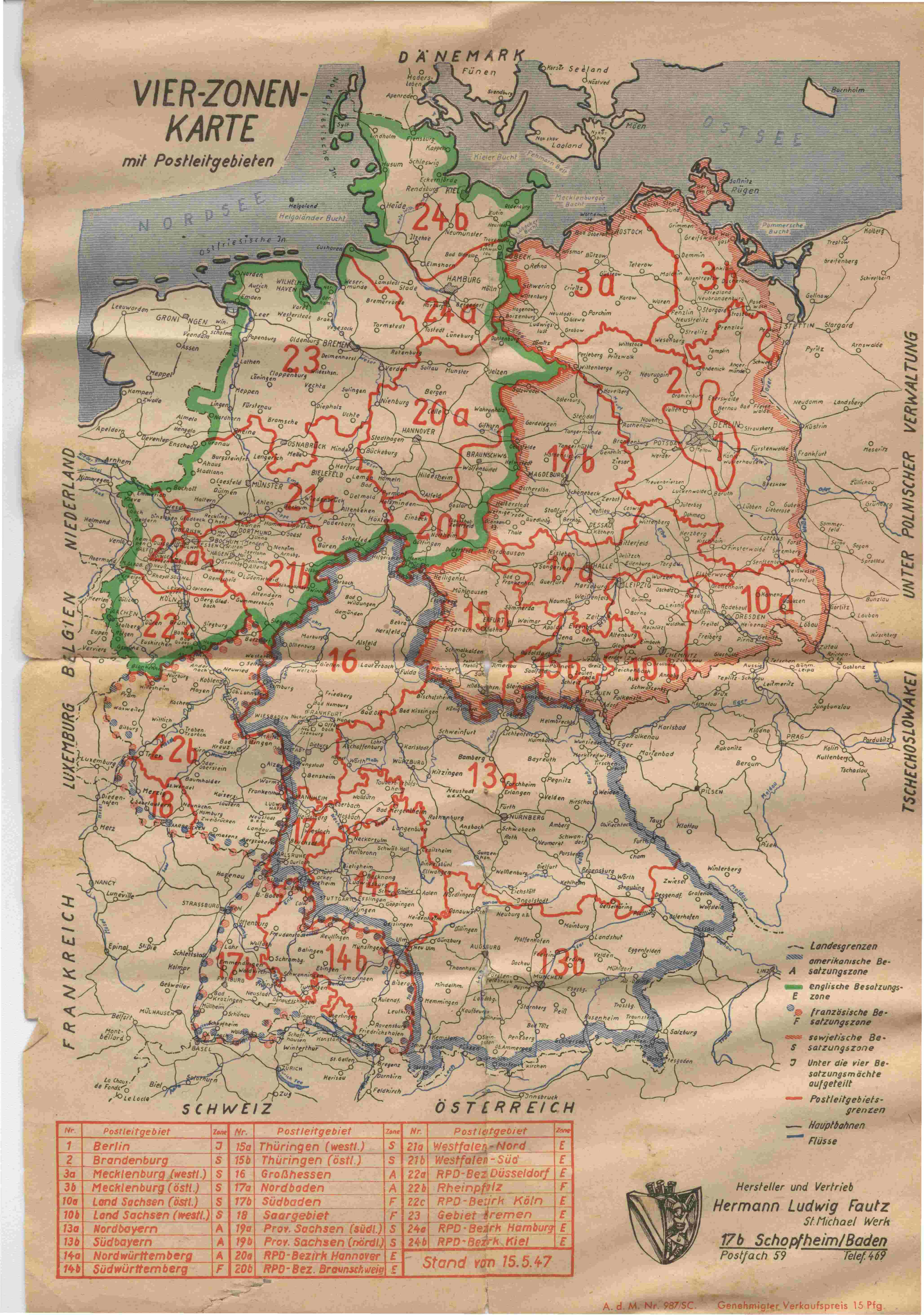 Vierzonenkarte Stand 15.5.1947 mit Postgebietsleitzahlen