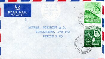 und noch ein wenig Nachschlag zu Afrika. Da haben wir einen Brief aus Ägypten aus den 1950-er Jahren. Das genaue Datum ist auf dem Stempel leider nicht lesbar. Absender ist Sabet, Bocti & Kahil (Rue Chawarby 7 – Kairo). Auf einem anderen mir vorliegenden Brief steht zusätzlich noch „The National Medical & Trading Co.“ Finden konnte ich dazu auf die Schnelle jedoch nichts. Die Briefmarken scheinen wohl eher Standardwerte zu sein MiNr.398 (1953), MiNr.404 (1953) MiNr.478 als Viererstreifen (1955). Der zweite Brief stammt aus Mauritius und wurde am 28.02.1956 in Port Louis abgestempelt. Zwei Freimarken von Queen Elisabeth II, zusammen 60 Cents, fanden ihren Weg auf den Brief. Absender ist ein gewisser Germain H. Le Roy – Commission Agent Manufacturer’s Representative mit Postfachadresse und eigener Telexadresse. Leider konnte ich auch zu dieser Person nichts finden. Aber es gibt ja noch einige Briefe die ich zeigen werde. Da gibt es sicherlich mehr zu erzählen.