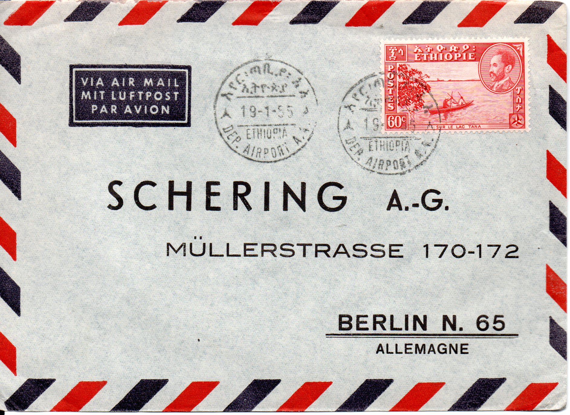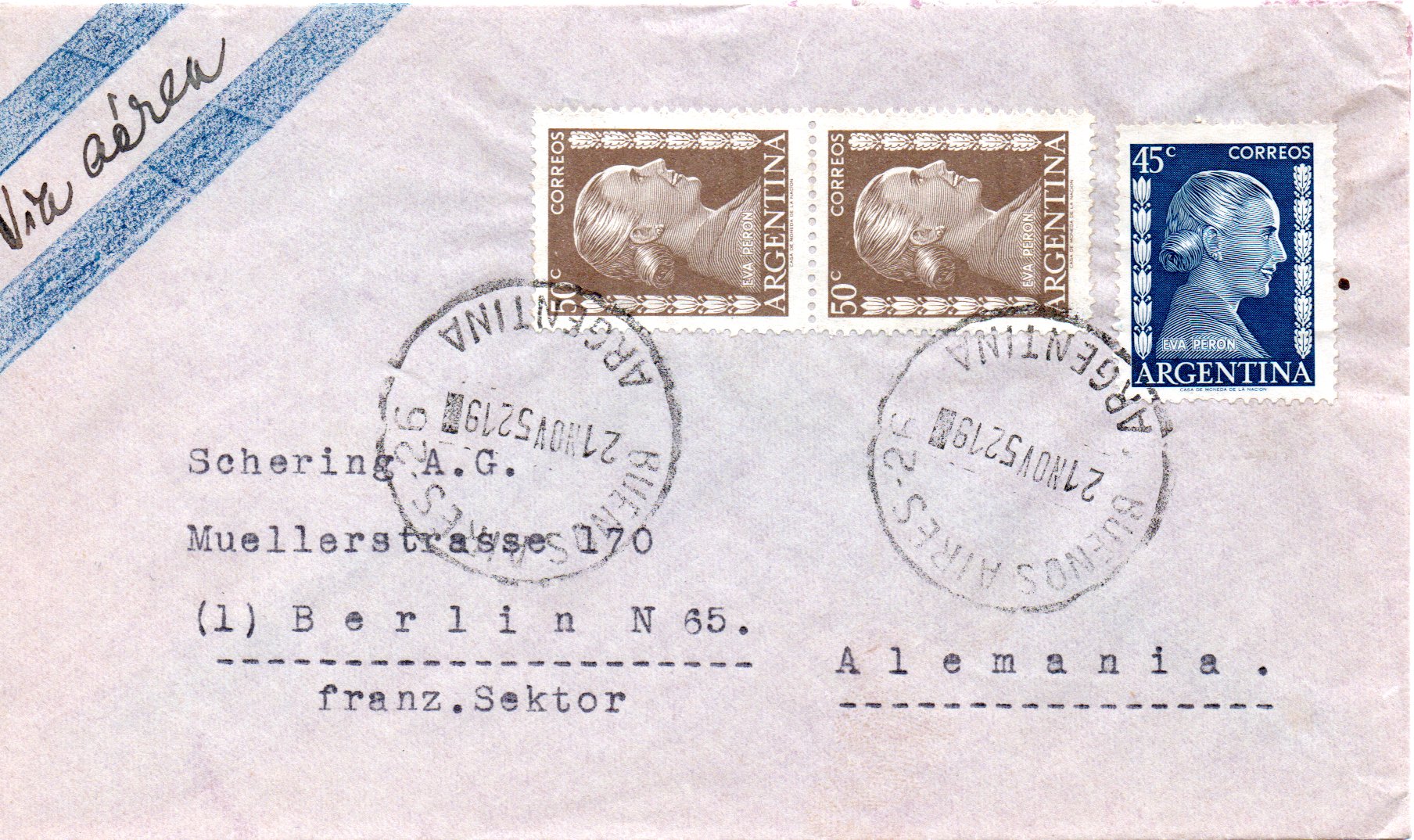 vor einiger Zeit habe ich eine Kiste mit Briefen aus den 1950-er Jahren erstanden. Zu meiner eigentlichen Sammlung hat dieser Posten so gar keinen Bezug, einfach liegenlassen konnte ich so einen Fund irgendwie aber auch nicht. Die Briefe aus fast allen Teilen der Welt waren dafür einfach zu spannend. Also bin ich auf Entdeckungsreise gegangen und habe die über 300 Briefe ein wenig durchsucht und geordnet. Dabei habe ich festgestellt das die Briefe zum großen Teil Geschäftskorrespondenz der Schering AG aus Berlin sind. Aus über 300 Briefen sind nach dem Durchsuchen um die 50 Briefe übriggeblieben die denke ich schön die Geschäftsverbindungen in die ganze Welt aufzeigen und damit auch ein schönes Zeitdokument aus den 1950-er Jahren ist. Und von diesen Briefen möchte ich von Zeit zu Zeit mal ein paar zeigen. Vielleicht kann ja der eine oder andere etwas zu den Briefen ergänzen da sich mein Wissen auf die Michelnummer der Markenausgaben bzw. das Stempeldatum beschränken wird. Übrigens sind die aussortierten Briefe jetzt nicht wieder in einen dunklen Karton gelandet, die habe ich den örtlichen Sammlerverein gespendet. Wäre doch schade wenn so etwas wieder in der Versenkung verschwindet.