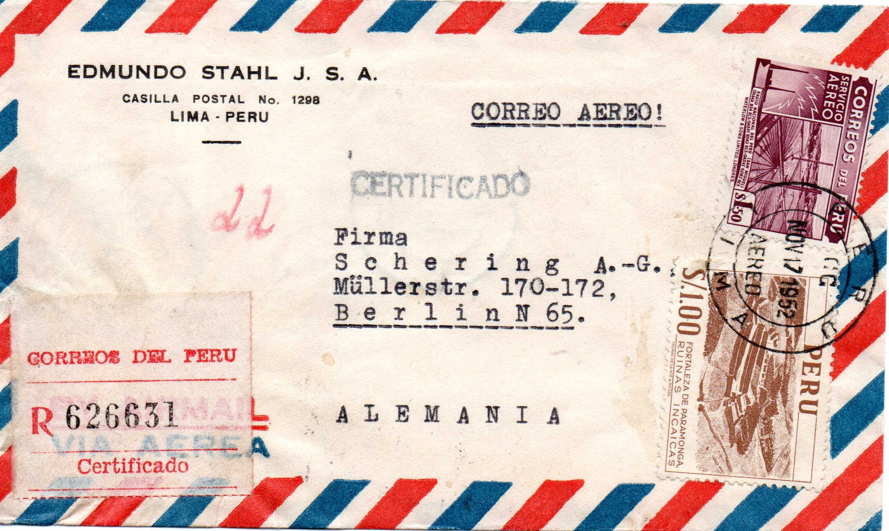 vor einiger Zeit habe ich eine Kiste mit Briefen aus den 1950-er Jahren erstanden. Zu meiner eigentlichen Sammlung hat dieser Posten so gar keinen Bezug, einfach liegenlassen konnte ich so einen Fund irgendwie aber auch nicht. Die Briefe aus fast allen Teilen der Welt waren dafür einfach zu spannend. Also bin ich auf Entdeckungsreise gegangen und habe die über 300 Briefe ein wenig durchsucht und geordnet. Dabei habe ich festgestellt das die Briefe zum großen Teil Geschäftskorrespondenz der Schering AG aus Berlin sind. Aus über 300 Briefen sind nach dem Durchsuchen um die 50 Briefe übriggeblieben die denke ich schön die Geschäftsverbindungen in die ganze Welt aufzeigen und damit auch ein schönes Zeitdokument aus den 1950-er Jahren ist. Und von diesen Briefen möchte ich von Zeit zu Zeit mal ein paar zeigen. Vielleicht kann ja der eine oder andere etwas zu den Briefen ergänzen da sich mein Wissen auf die Michelnummer der Markenausgaben bzw. das Stempeldatum beschränken wird. Übrigens sind die aussortierten Briefe jetzt nicht wieder in einen dunklen Karton gelandet, die habe ich den örtlichen Sammlerverein gespendet. Wäre doch schade wenn so etwas wieder in der Versenkung verschwindet.