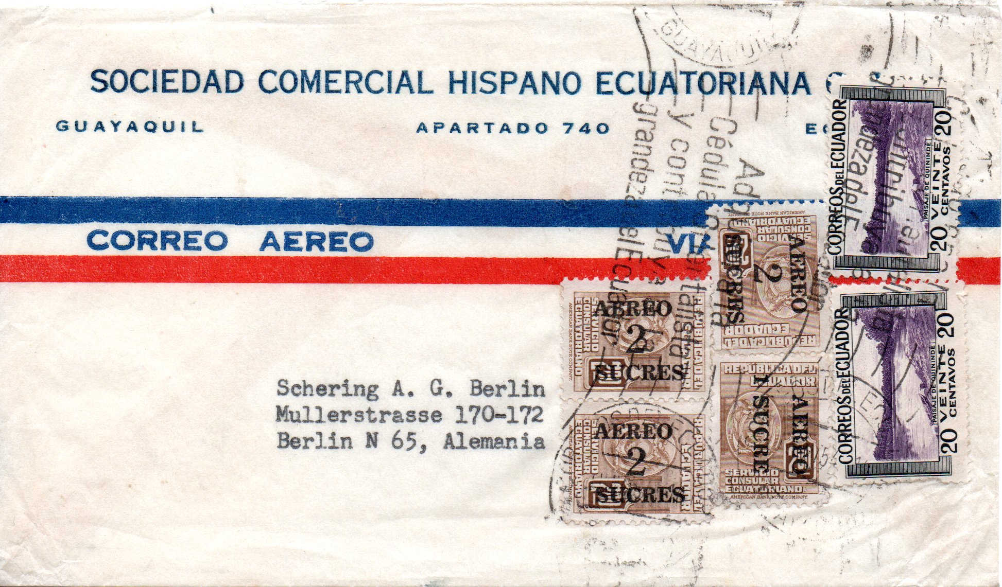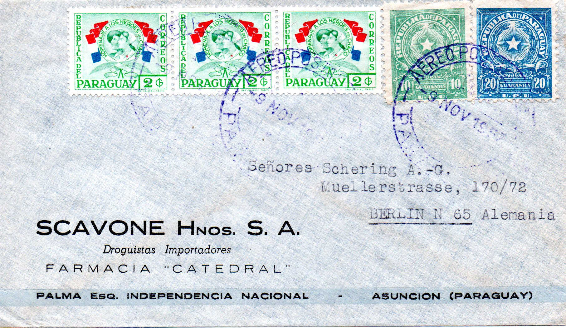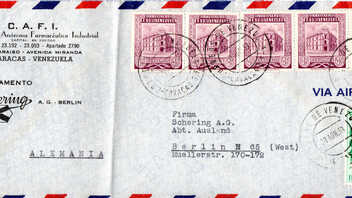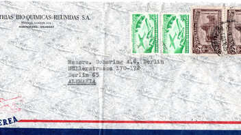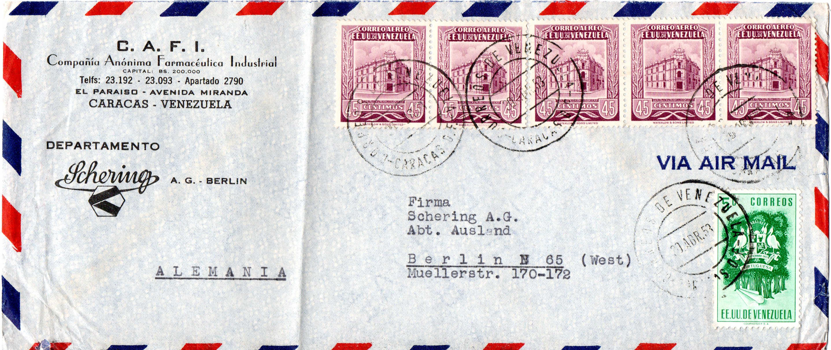 vor einiger Zeit habe ich eine Kiste mit Briefen aus den 1950-er Jahren erstanden. Zu meiner eigentlichen Sammlung hat dieser Posten so gar keinen Bezug, einfach liegenlassen konnte ich so einen Fund irgendwie aber auch nicht. Die Briefe aus fast allen Teilen der Welt waren dafür einfach zu spannend. Also bin ich auf Entdeckungsreise gegangen und habe die über 300 Briefe ein wenig durchsucht und geordnet. Dabei habe ich festgestellt das die Briefe zum großen Teil Geschäftskorrespondenz der Schering AG aus Berlin sind. Aus über 300 Briefen sind nach dem Durchsuchen um die 50 Briefe übriggeblieben die denke ich schön die Geschäftsverbindungen in die ganze Welt aufzeigen und damit auch ein schönes Zeitdokument aus den 1950-er Jahren ist. Und von diesen Briefen möchte ich von Zeit zu Zeit mal ein paar zeigen. Vielleicht kann ja der eine oder andere etwas zu den Briefen ergänzen da sich mein Wissen auf die Michelnummer der Markenausgaben bzw. das Stempeldatum beschränken wird. Übrigens sind die aussortierten Briefe jetzt nicht wieder in einen dunklen Karton gelandet, die habe ich den örtlichen Sammlerverein gespendet. Wäre doch schade wenn so etwas wieder in der Versenkung verschwindet.