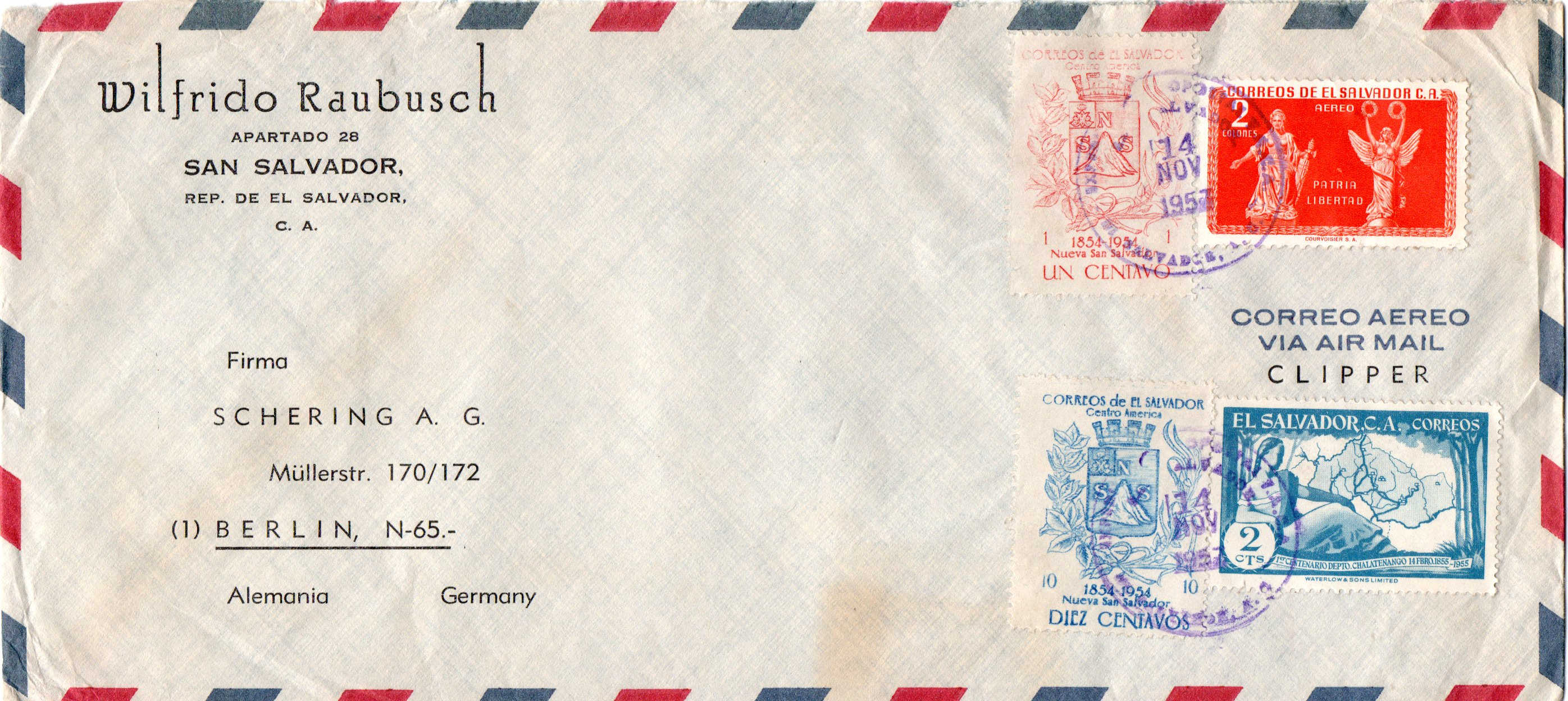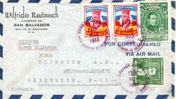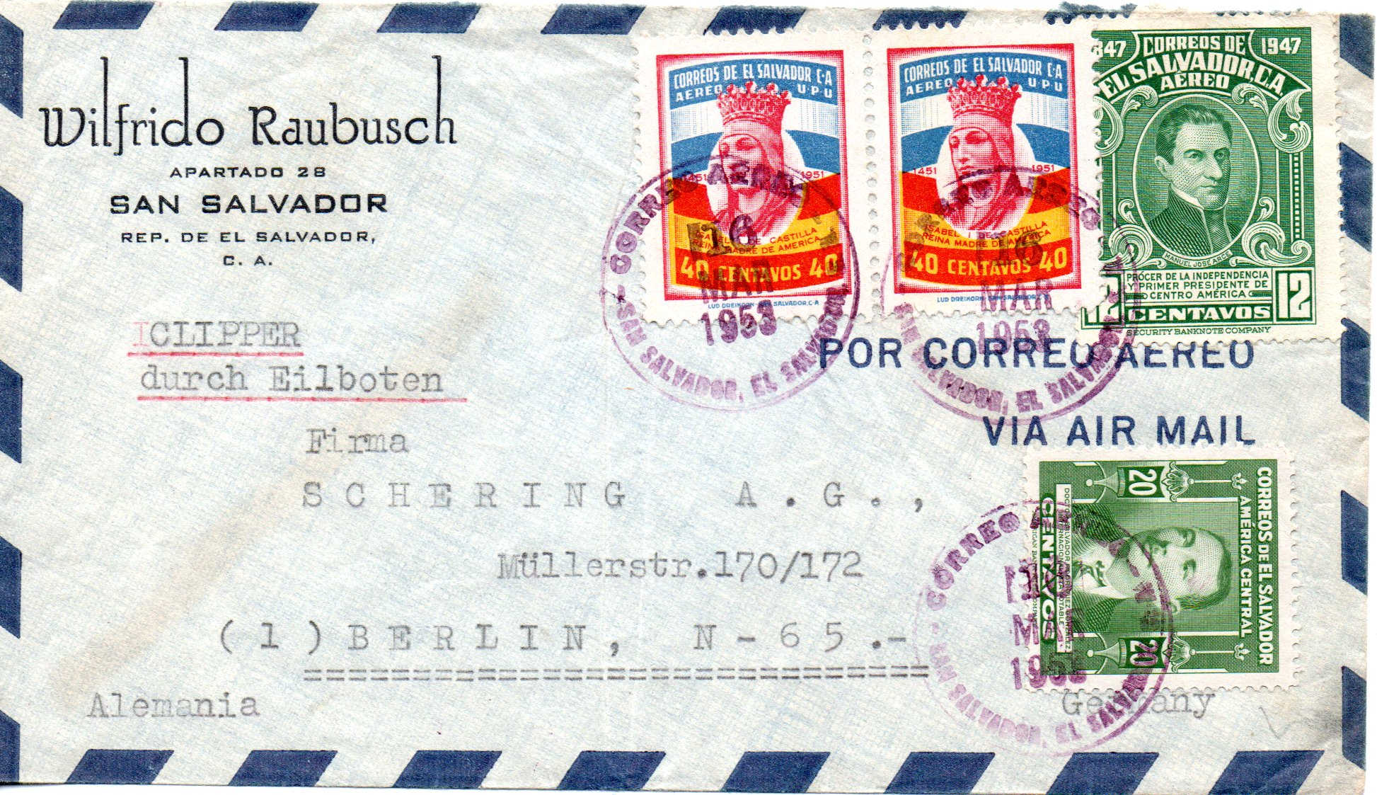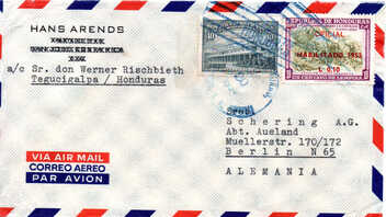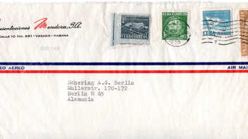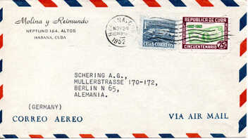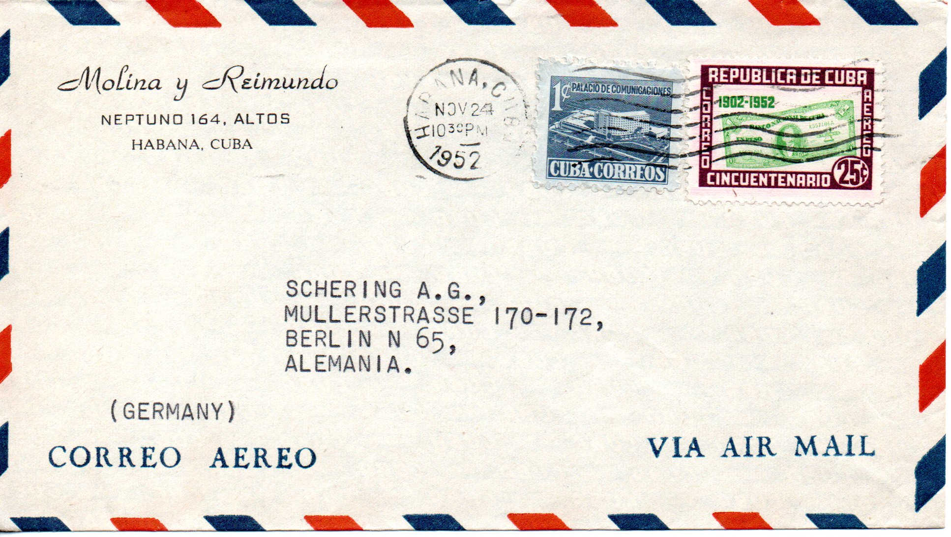 und noch etwas aus Mittelamerika. Da möchte ich heute zwei Briefe aus dem vorrevolutionären Kuba zeigen. Brief 1 ist ein Luftpostbrief der am 24.11.1952 in Havanna abgestempelt wurde. Absender ist Molina y Reimundo aus Havanna. Verklebt wurde MiNr.320 und eine Z16 eine sogenannte Zwangszuschlagsmarke die für den Neubau des Gebäudes des Postministeriums aufgelegt wurde.