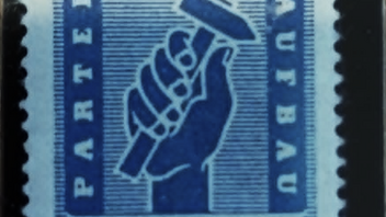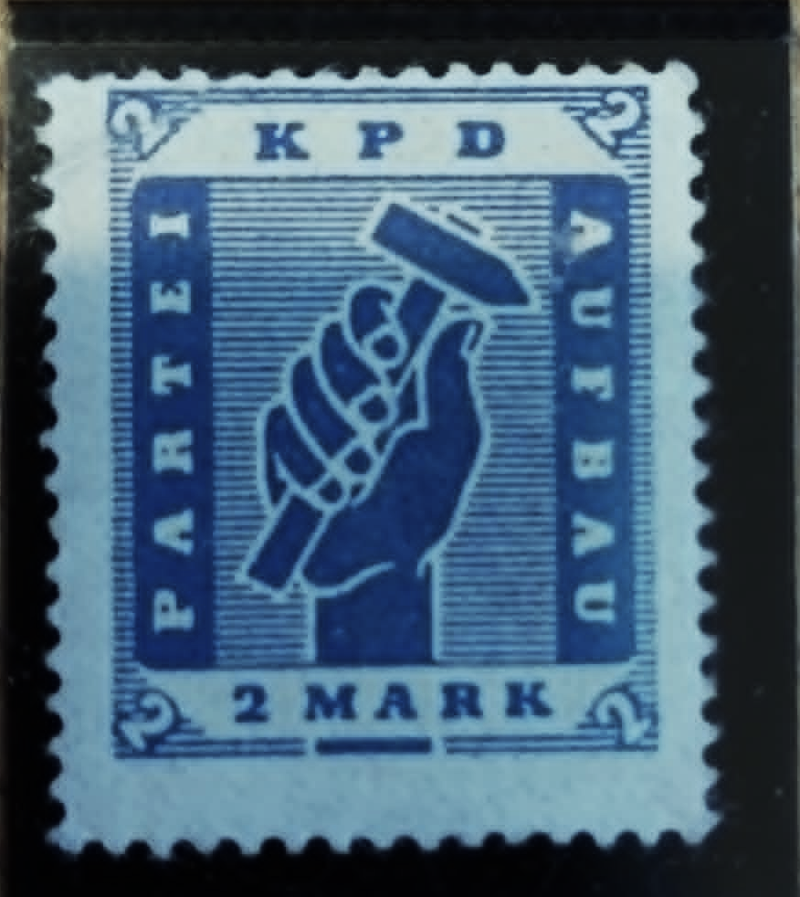 Es handelt sich um eine Vignette (Propagandastempel/Parteistempel) der Kommunistischen Partei Deutschlands (KPD) mit dem Nennwert "2 MARK". Sie zeigt eine geballte Faust mit einem Hammer sowie die Aufschriften "KPD", "PARTEI", "AUFBAU".