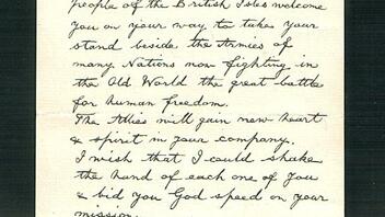 "Soldiers of the United States, the people of the British Isles welcome you on your way to take your stand beside the Armies of many Nations now fighting in the Old World the great battle for Human Freedom. The Allies will gain new heart & spirit in your company. I wish that I could shake the hand of each of you & bid you God speed on your mission.