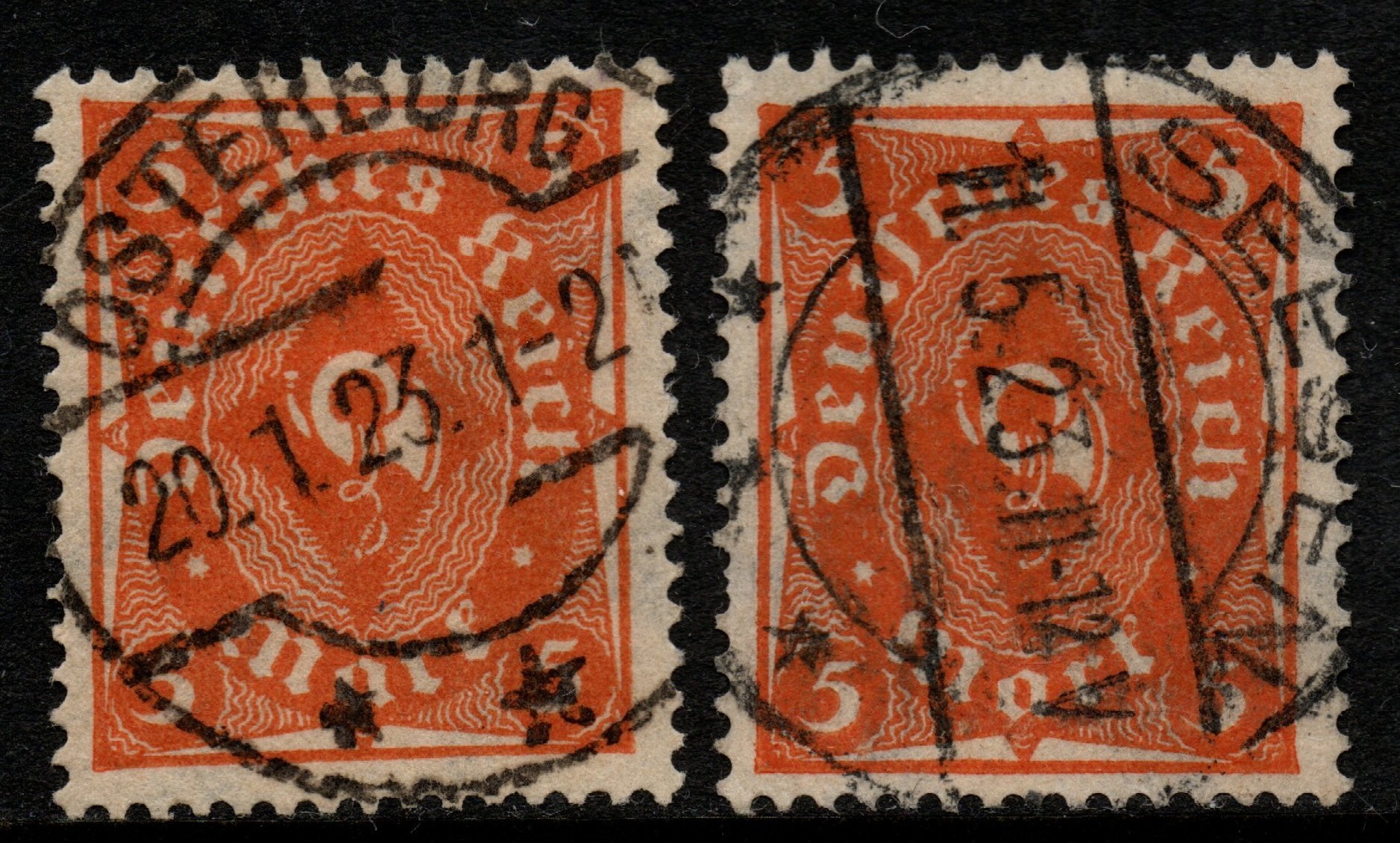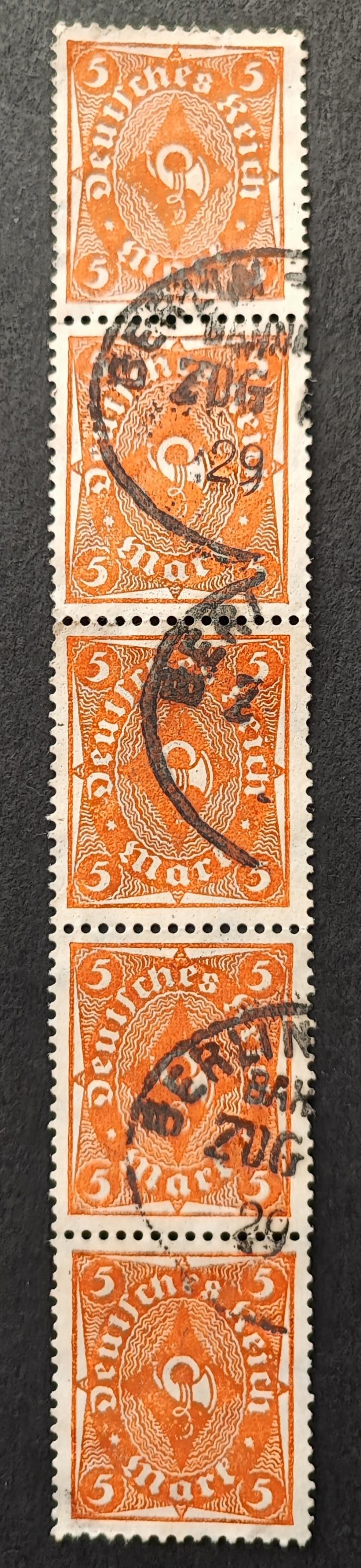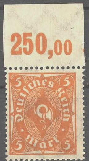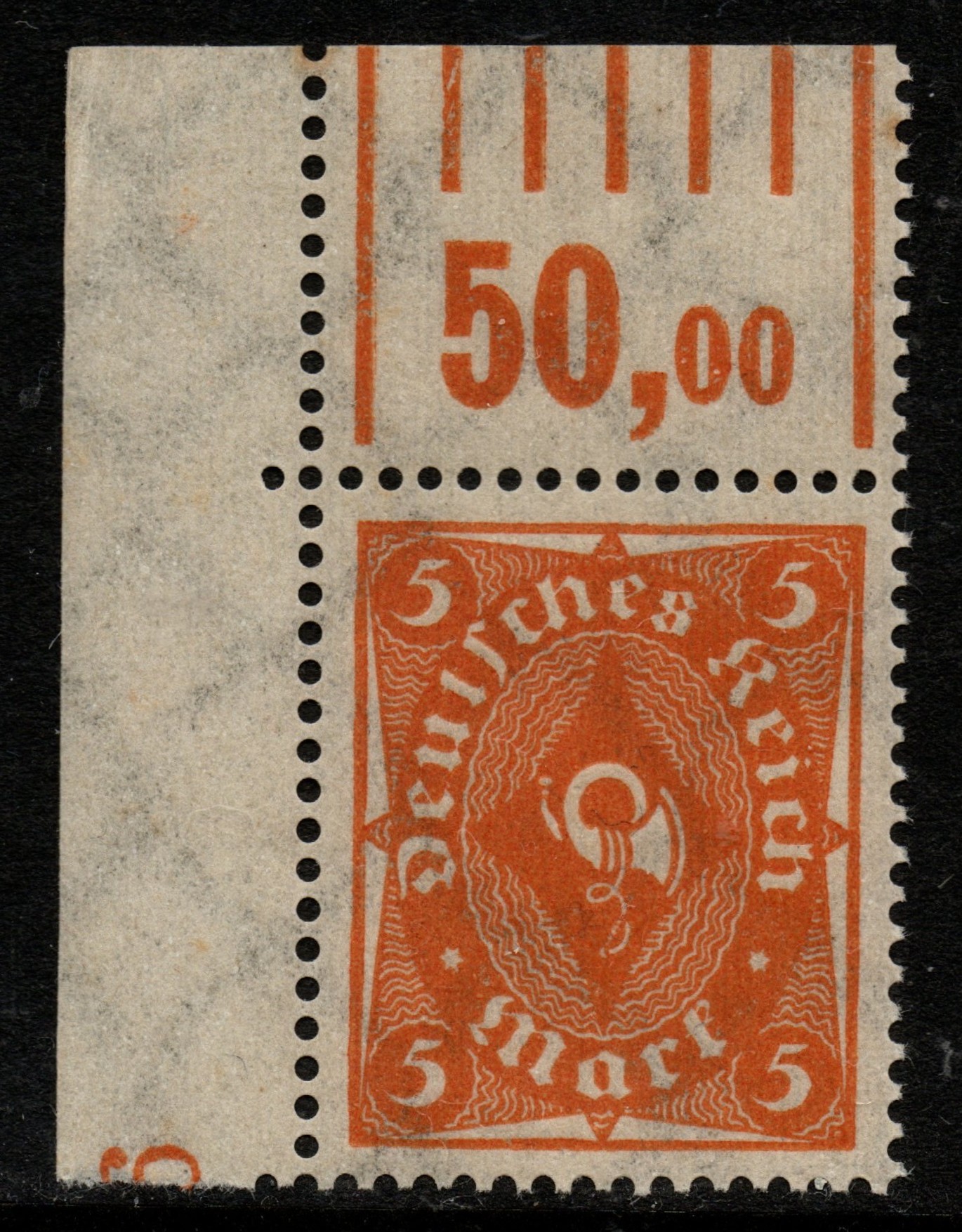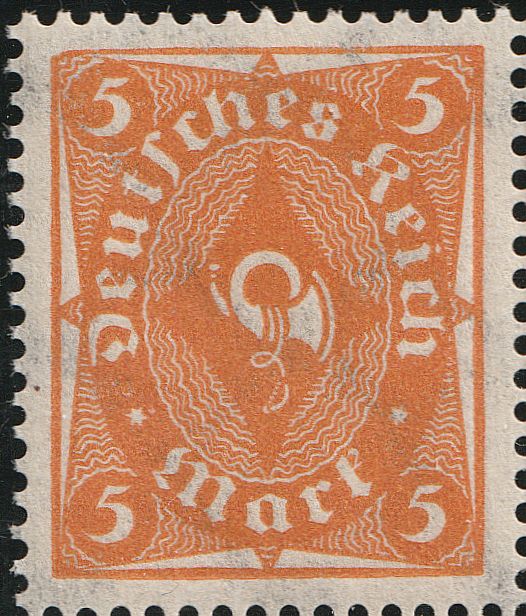 weiter geht es mit dem 5 Mk. Wert der einfarbigen Posthornausgabe aus dem Jahr 1922. Bei diesem Wert bin ich längst nicht so gut sortiert wie beim vorherigen 4 Mk. Wert.