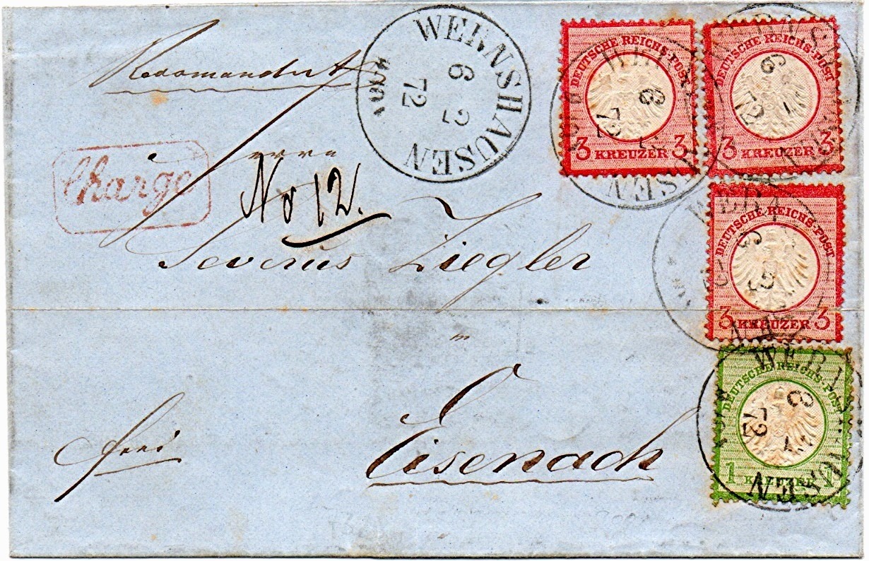 Aus meiner Sammlung kann ich euch einen, leider etwas unsauberen Einschreibebrief (3 mal DR 9 + DR 7V) von Wernshausen nach Eisenach vom 6.2.1872 zeigen.