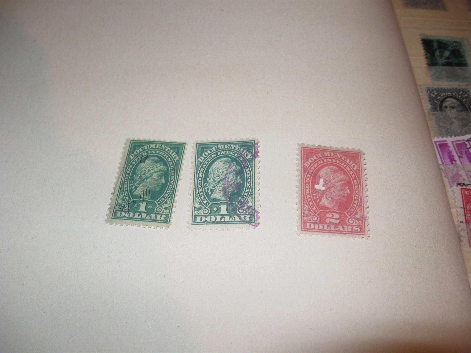 Mit solchen Marken wurden Steuern auf Dokumente bezahlt. Die grüne Marke ist Scott R240, die rote ist Scott R241 (1917-1933, die beiden niedrigsten Werte der Serie). Die übliche Entwertung von Steuermarken geschah durch Federzug (Name, Datum), wesentlich seltener durch einen "echten" Stempel, im wertmindernden Fall mit einer Lochzange (wie beim roten Wert). Diese beiden Marken werden beide mit Minimalwert gelistet im Katalog.