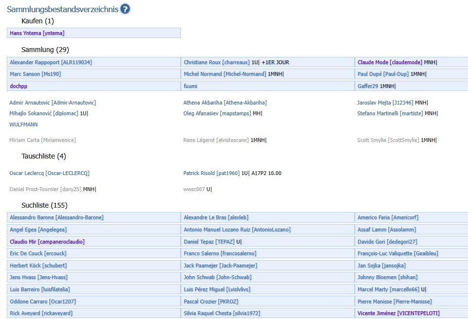 - Man kann jederzeit, also nach Eingabe von Fehl-, und Dublettenlisten schauen mit welchem anderen Sammler das zusammenpasst ( der also das hat was Du suchst und das suchst was Du hast)