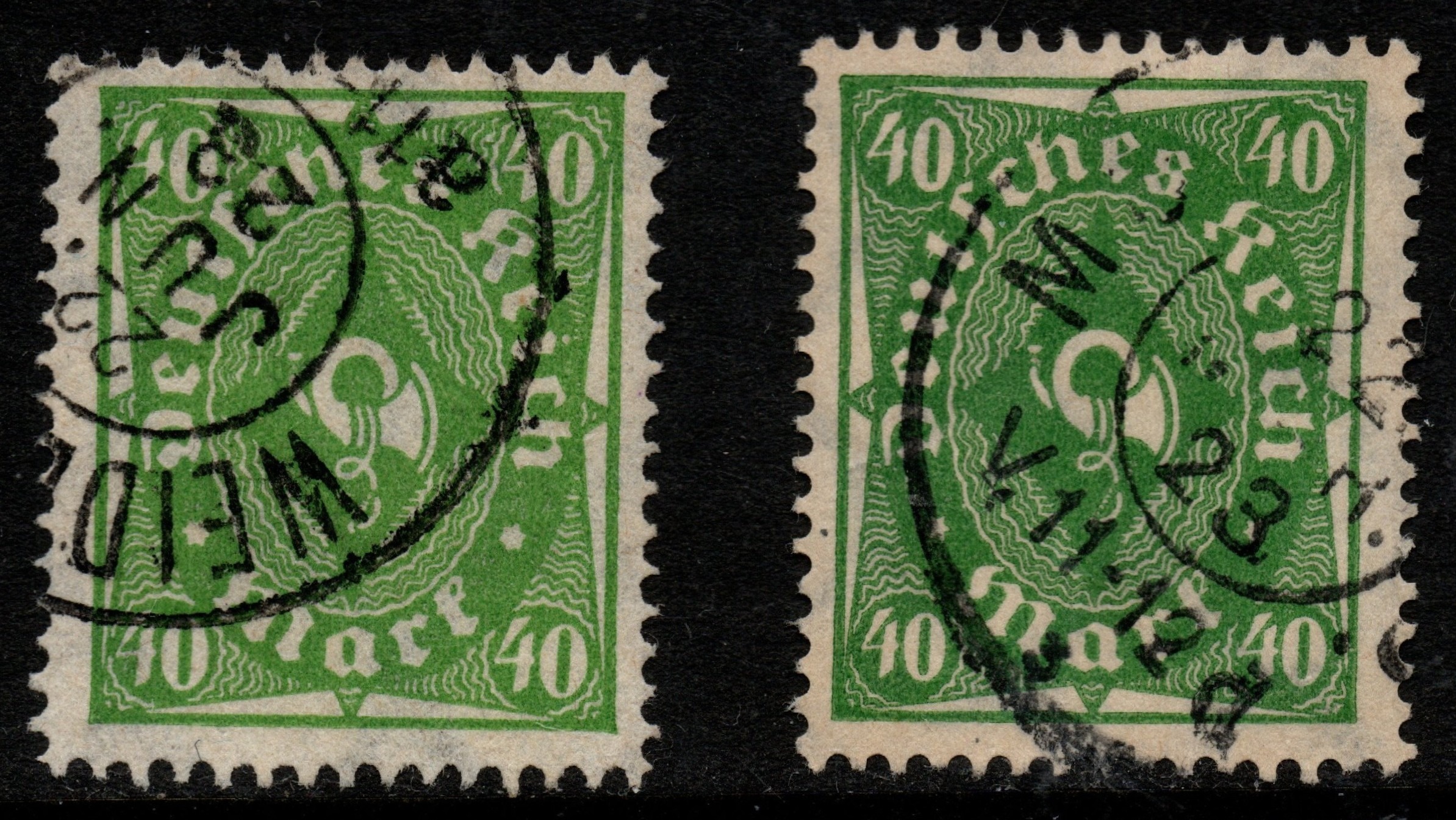heute komme ich zum Höchstwert der einfarbigen Posthornausgabe, dem 40 Mk. Wert.. Auch hier ist ein exaktes Frühdatum nicht bekannt. Das Kohl-Handbuch schreibt Der 40 Mk. Wert ... erschien ... in den ersten Tagen des Januar ..., die PHILA-DB und der Michel Spezial 2016 nennen den Januar 1923.