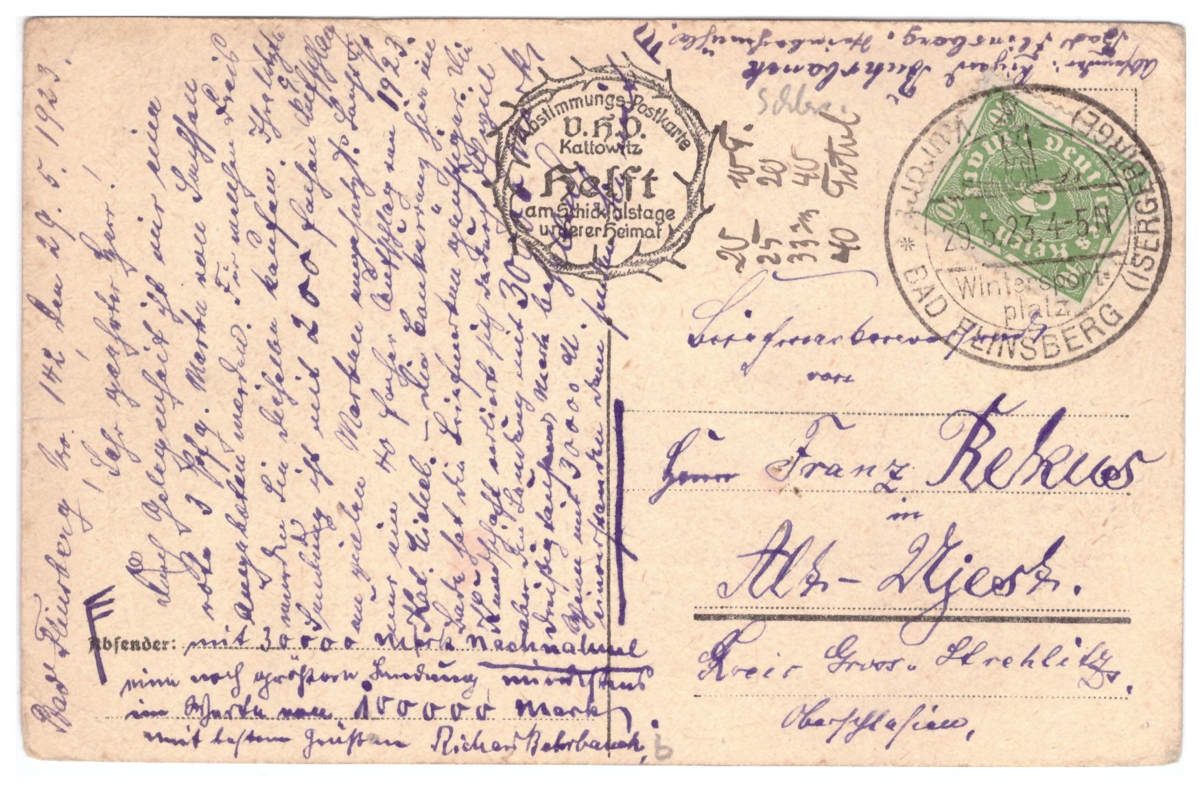 eine sog. Abstimmungspostkarte zur Volksabstimmung in Schlesien am 20. März 1921 vom 29.5.1923 von Bad Flinsberg ( Świeradów-Zdrój) nach Alt-Ujest, Kreis Groß-Strehlitz mit Gelegenheitsstempel "Kurort Bad Flinsberg (Isergebirge) Wintersportplatz",  (Bo1; Filbr 88)