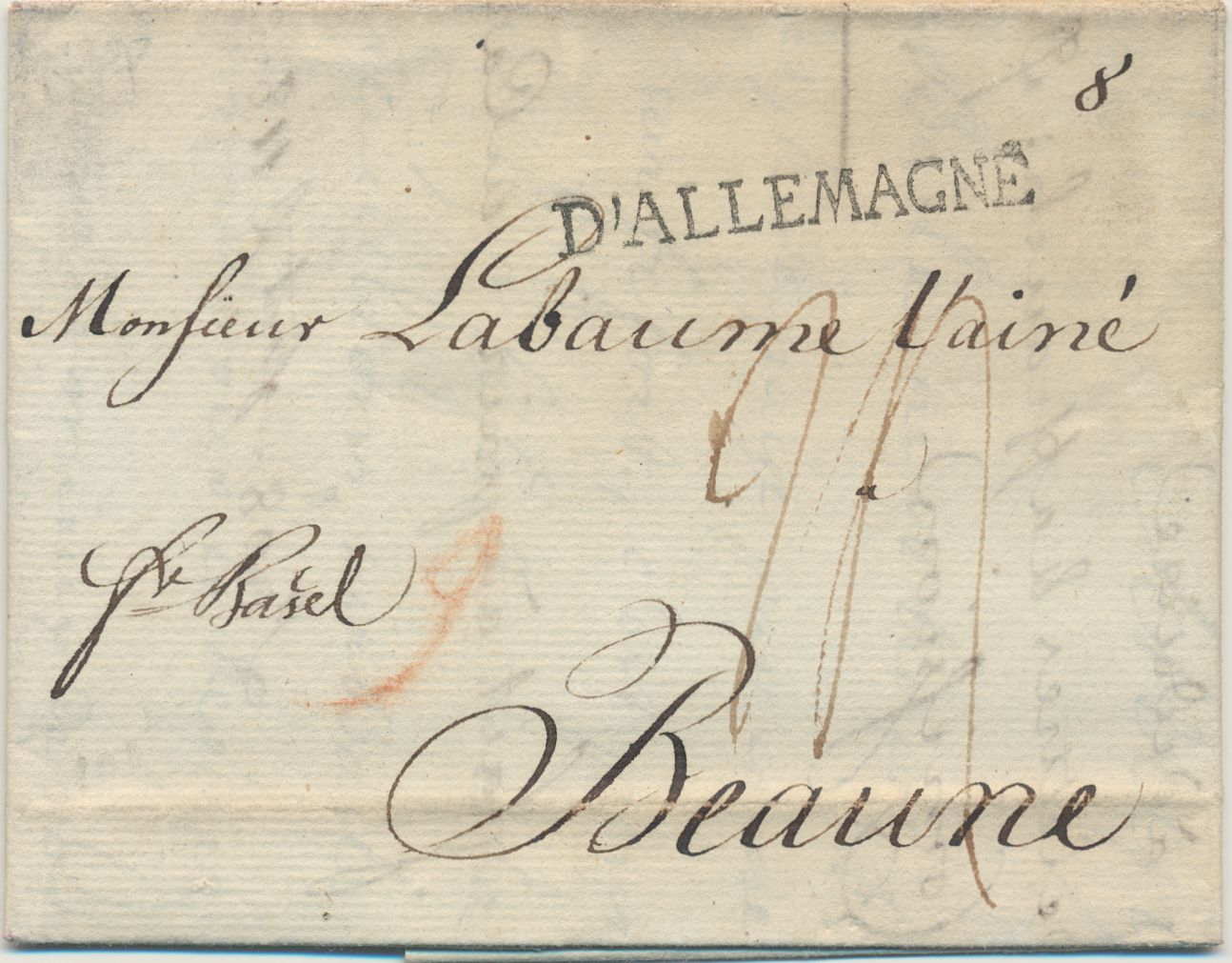 „D’ALLEMAGNE“, geradliniger französischer Poststempel (verwendet in Straßburg?). Vermerk „fr. Basel“. „8“ oben rechts zur Kennzeichnung der Gewichtsklasse über 6 g. (?) Handschriftliche „9“ Kreuzer in roter Kreide (fällig für Transit nach Basel oder Vorauszahlung in Gutegroschen (?)) und „24“ Sol Porto für die französische Route von der Wechselstube Huningue nach Beaune (Entfernung 50–60 Leguas, Gewicht ½–¾ Unze):