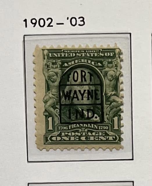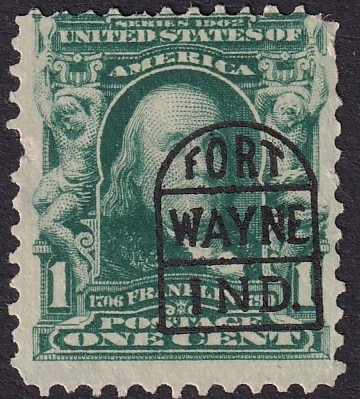 "This is a precancel from the USA, called the “Fort Wayne Tombstone” for a rather obvious reason. It was used exclusively on the 1902-03 definitive series. Although it does exist on the 1¢ Franklin (1908), opinions differ whether that was a legitimate use, or a favor cancel. Fairly scarce on the 3-5¢ stamps, and rare on cover."