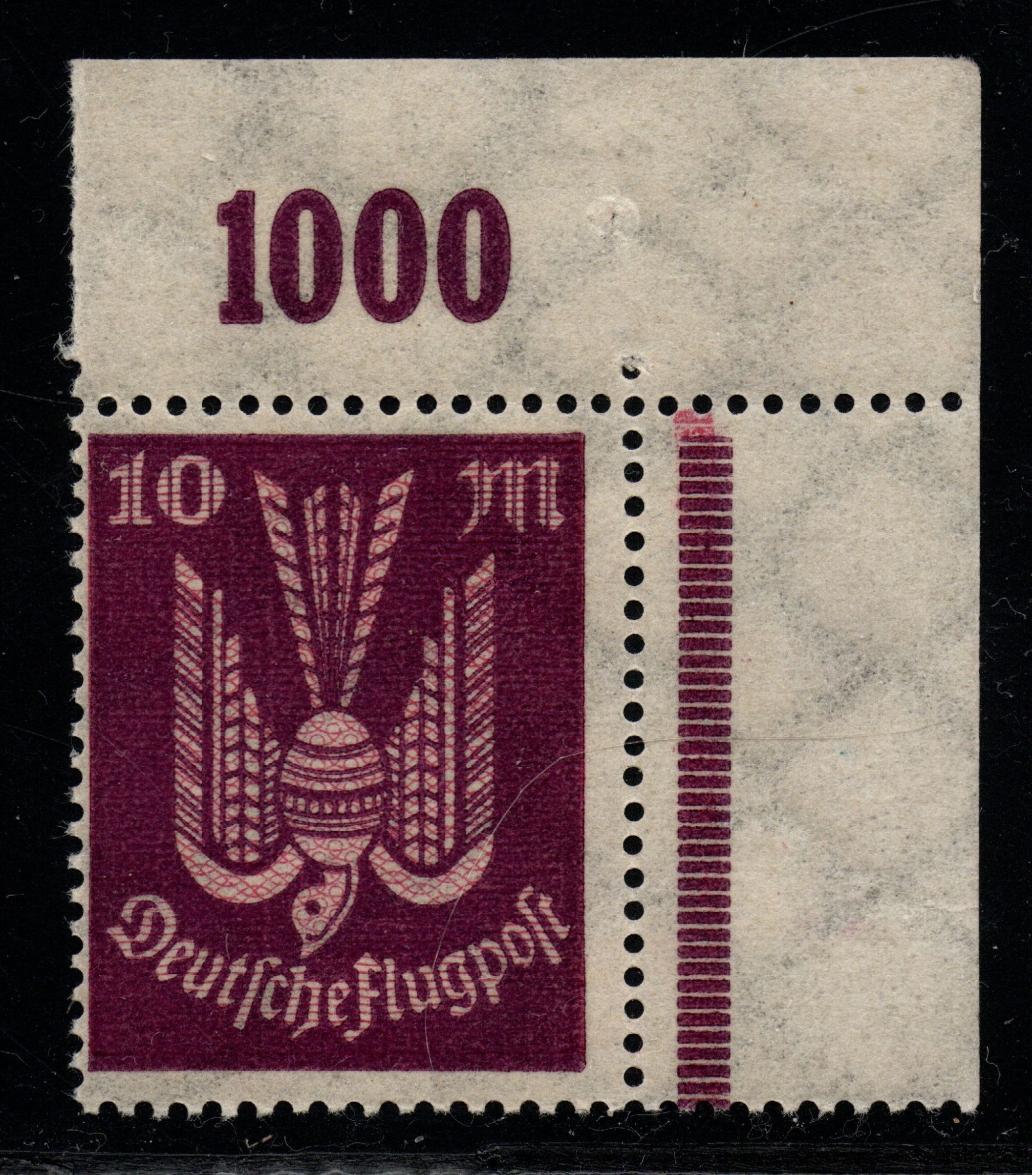 heute beginne ich mit der Vorstellung der Einzelwerte der Flugpostausgabe Holztauben II, natürlich mit dem 10 Mk. Wert. Im Kohl-Handbuch hieß es ja, dass die Marke Ende Februar ausgegeben wurde, hier nennen der Michel Spezial 2016 und die PHILA-DB mit dem 28.2.2023 sogar ein konkretes Frühdatum. Wie bereits in den Vorbemerkungen geschrieben wurden die Marken im Buchdruckverfahren im Zweifarbendruck als Plattendruck produziert. Der Schalterbogen bestand aus zwei Markenfelder mit 10 x 5 Marken die durch einen mit Reklame bedruckten Zwischensteg getrennt waren. Es sind vier HAN katalogisiert, es ist also von vier Druckauflagen auszugehen. Die Höhe der Gesamtauflage wird in den von mir genutzten Quellen nicht genannt. https://philadb.com/?site=list&catid=&catuid=484&id=620