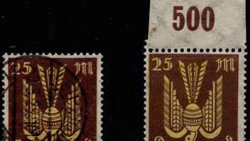 Ebenfalls am 28.2.1923 kam der 25 Mk. Wert der Flugpostmarkenausgabe Holztaube II an die Postschalter (laut PHILA-DB und MIchel Spezial 2016). Wie bereits in den Vorbemerkungen geschrieben wurden die Marken im Buchdruckverfahren im Zweifarbendruck als Plattendruck produziert. Der Schalterbogen bestand aus zwei Markenfelder mit 10 x 5 Marken die durch einen mit Reklame bedruckten Zwischensteg getrennt waren. Es sind zwei HAN katalogisiert, demzufolge ist also von zwei Druckauflagen auszugehen. Die Höhe der Gesamtauflage wird in den von mir genutzten Quellen nicht genannt. https://philadb.com/?site=list&catid=&catuid=484&id=623