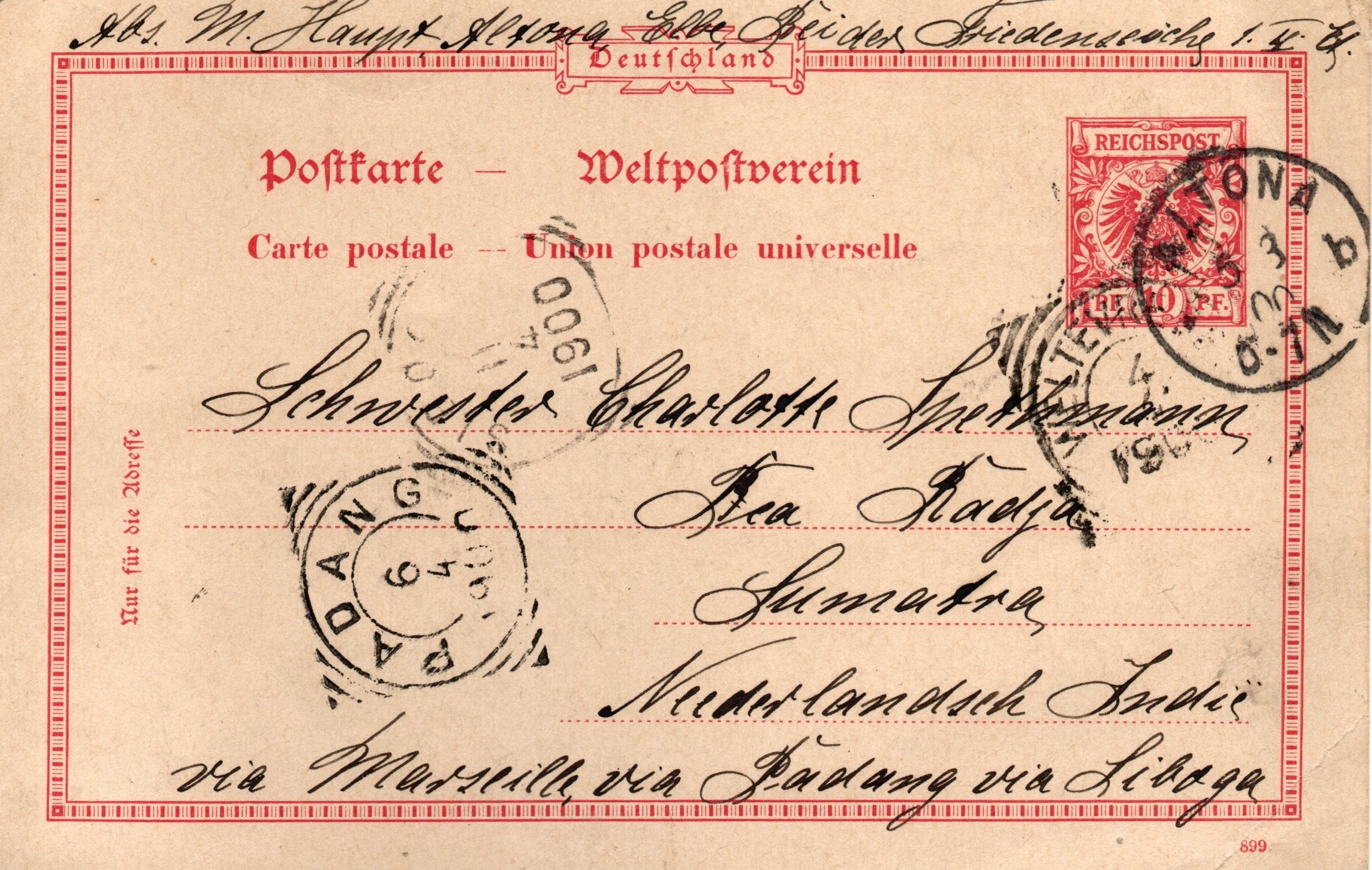 Heute zeige ich die Reise einer 10 Pfg. Krone/Adler Postkarte aus Altona die im Jahr 1900 nach Bea Radja auf deer Insel Sumatra. Den Ort (evtl. Missionsstation) habe ich nicht lokalisieren können aber die durch Transitstempel dokumentierten Etappenorte. Da ich ja um Ideen für eine kleine Geschichte nie verlegen bin habe ich nach Ansichtskarten der Postämter der einzelnen Etappenorte gesucht und bin auch fündig geworden. Nur beim Postamt (Postkantoor) Sibolga habe ich verzichtet, über 70 USD für einen Spass war mir dann doch zu viel. Vielleicht kaufe ich mal eine deutlich günstigere Karte mit einer Ortsansicht.