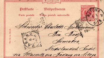 Dann haben wir auf der Kartenvorderseite den Transitstempel von Weltevreden (Stadtteil von Batavia, heute Jakarta) vom 4.4.1900, einen weiteren Transitstempel von Padang vom 6.4.1900 und einen schlecht lesbaren Ankunftstempel von Siboga vom 11.4.1900. Ich gehe mal davon aus, dass der ca. 300 km nordwestlich von Padang gelegene indonesische Küstenort Sibolga der heutige Name von Siboga in Niederländisch-Indien ist.