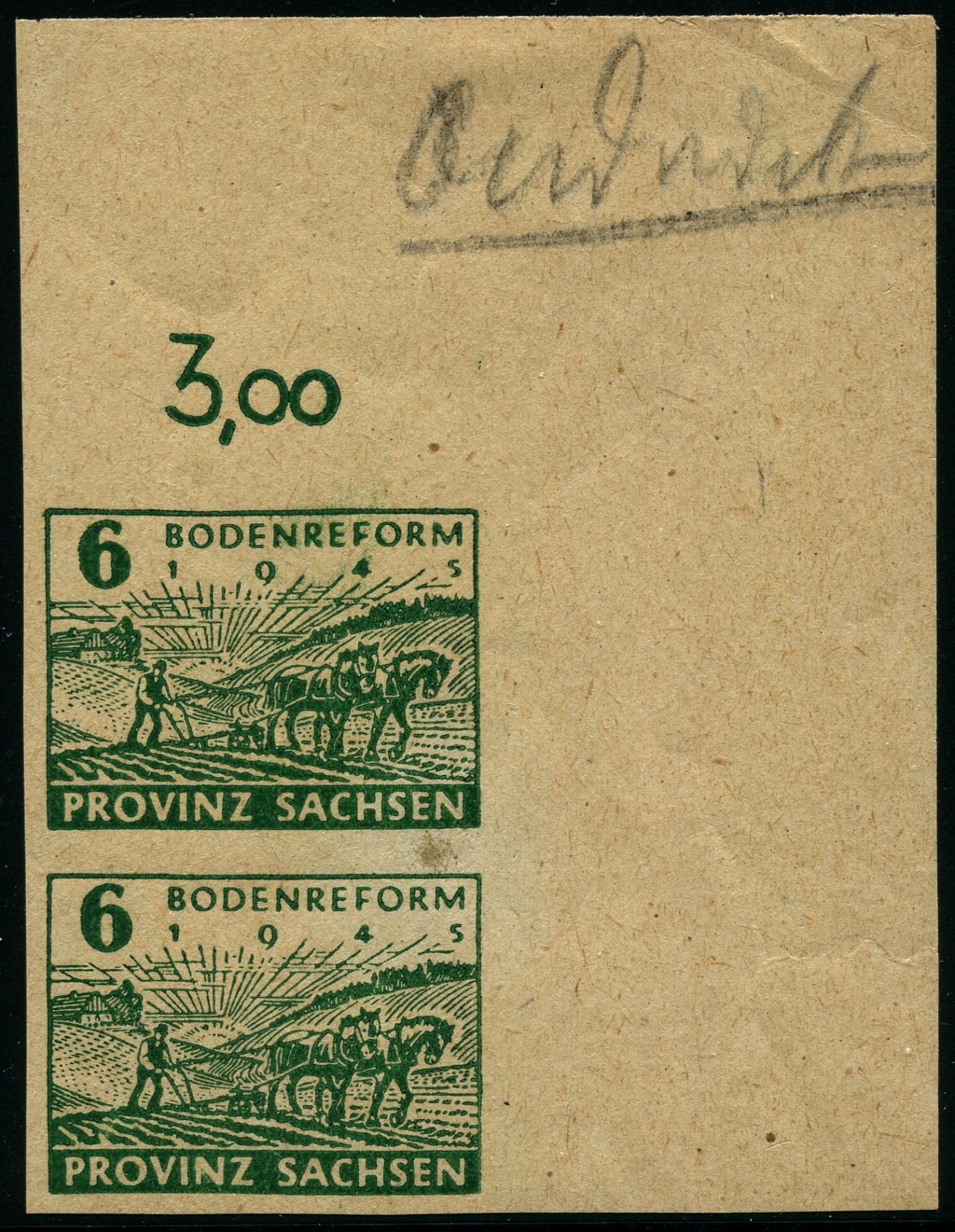 Möglicherweise wurde nur jeweils ein Bogen dieser Versuchsdrucke hergestellt. Damit wären die Eckpaare mit der Darstellung beider abweichender Randbedruckungen Unikate. Ich vermute auch, dass die rückseitige Haftspur von der Befestigung des Bogens im Vorlagebuch der Druckerei stammt, eine Falzstelle ist es jedenfalls nicht.