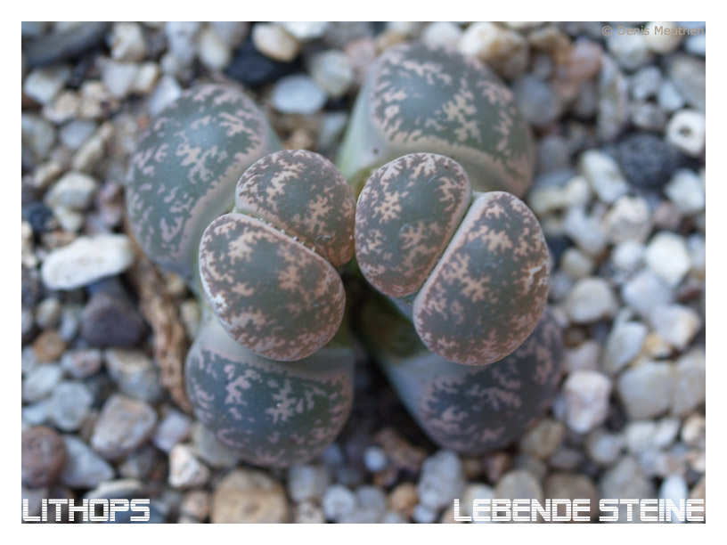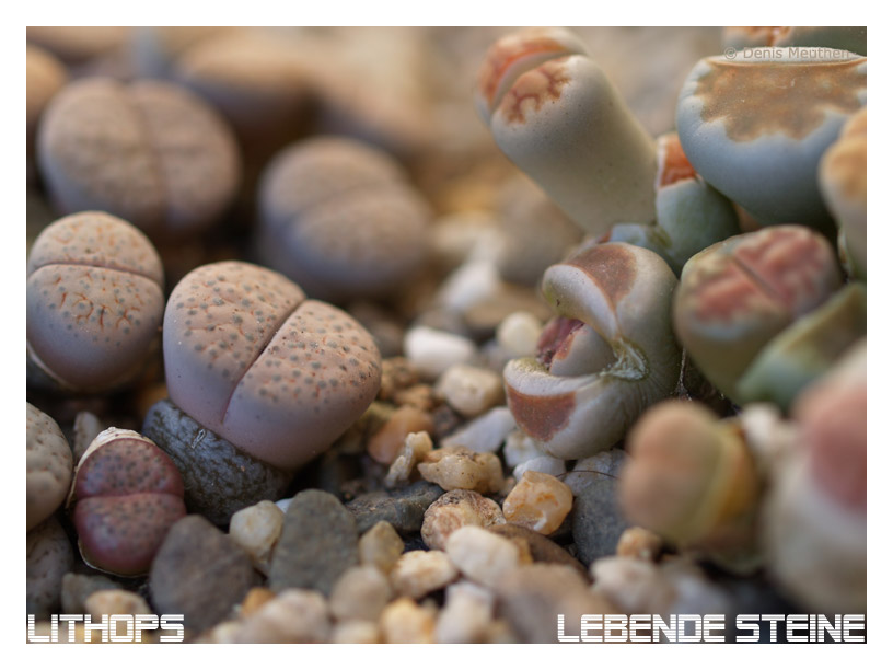Lithops, auch "lebende Steine" genannt, gehören zur Familie der Aizoaceen (Mittagsblumengewächse). Die Pflanzen bestehen aus zwei miteinander verbundenen Blättern (Loben). Die annähernd runde Form der Pflanze stellt das beste Verhältnis aus Blattvolumen und Blattoberfläche dar, die Verdunstung wird minimiert. Durch die Stirnflächen der Blätter kann Licht durch transparente Fenster in die Pflanze eindringen, die Photosynthese erfolgt dabei an den Innenseiten der Blätter! Die Pflanzen bilden jährlich ein Paar neue Blätter aus. Dies geschieht im Frühjahr und erfordert kaum Wassergaben, das alte Blattpaar liefert die Feuchtigkeit und vertrocknet. Ist die Pflanze groß genug, entstehen 2 Pflanzen. Eine Besonderheit (die jedoch nicht selten ist) sind 3-lobige Pflanzen.