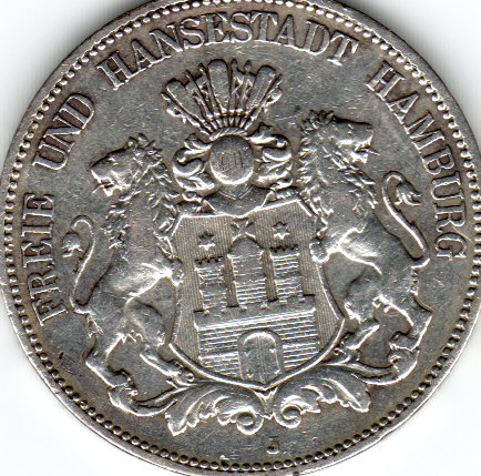 Habe jetzt gerade keinen Katalog zur Hand, aber diese Münze aus dem deutschen Kaiserreich wurde von der Freien- u. Hansestadt Hamburg ausgegeben und war im Kaiserreich unbeschränkt gültig.