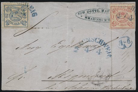 Daneben eine MiNr. 1, hier gleich zusammen mit der MiNr. 2 als seltene Mischfrankatur der ersten Ausgabe auf Brief von Braunschweig nach Absgmünd in Württemberg. Korrekt frankiert mit 3 Silbergroschen für eine Distanz über 20 Meilen. Auch während der DÖPV-Zeit eine sehr seltene Braunschweig Destination. Die Marken sind entwertet mit dem blauen Halbkreisstempel von Braunschweig. Dazu der ovale Stundenstempel.