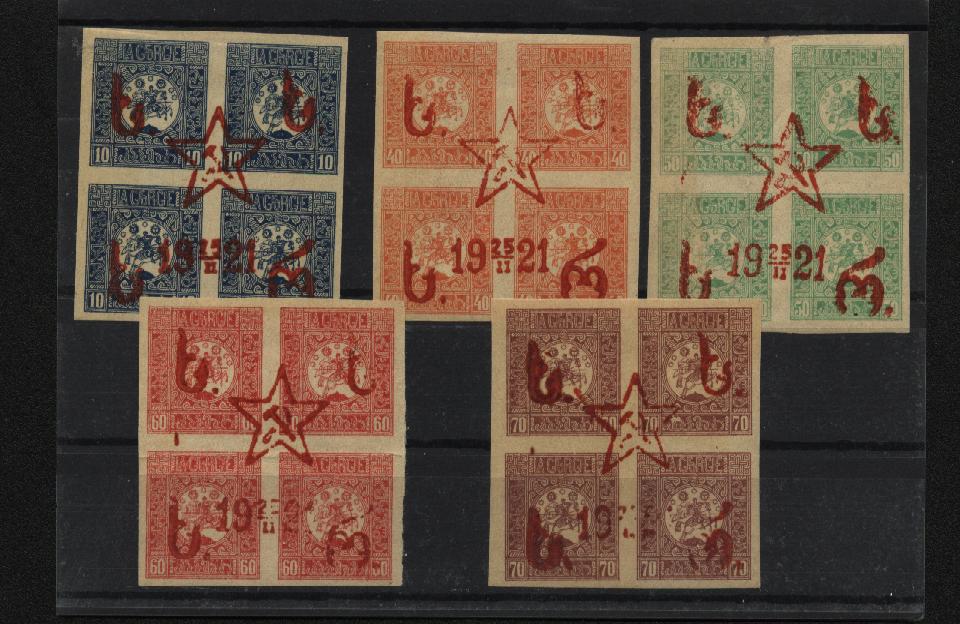 Im Viererblock wurden die geschnitten Werte des Satzes (1B-9B) mit dem Handstempelaufdruck S.S.S.R. (zu deutsch UDSSR) in Georgisch, dem Datum 25.2.1921 und einem roten Stern versehen. Diese Ausgabe kommt mit echten und Gefälligkeitsstempeln vor.