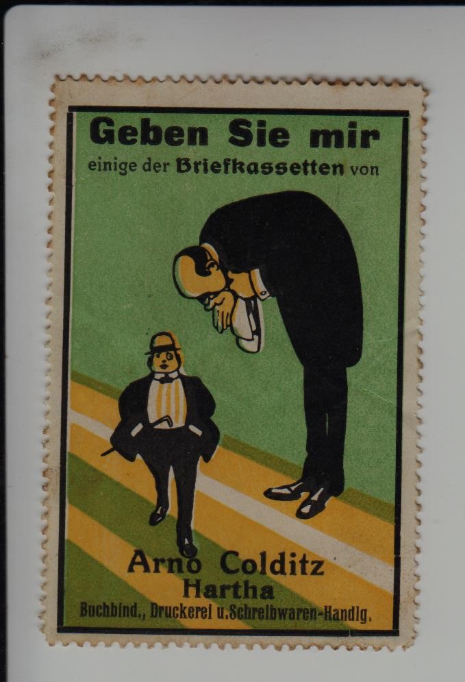 Eine Werbe-Vignette der Buchbinderei, Druckerei und Schreibwaren-Handlung Arno Colditz in Hartha/Sachsen. Die Firma befand sich in der Hindenburgstr. 36 vor 1945. Heute findet man sie nicht mehr.
